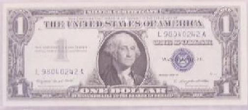 3) 1957 A $1 Blue Seal Silver Certificate SN#G55352734A,Elizabeth Russel Smith Treasurer, C. Douglas Dillion Secretary.