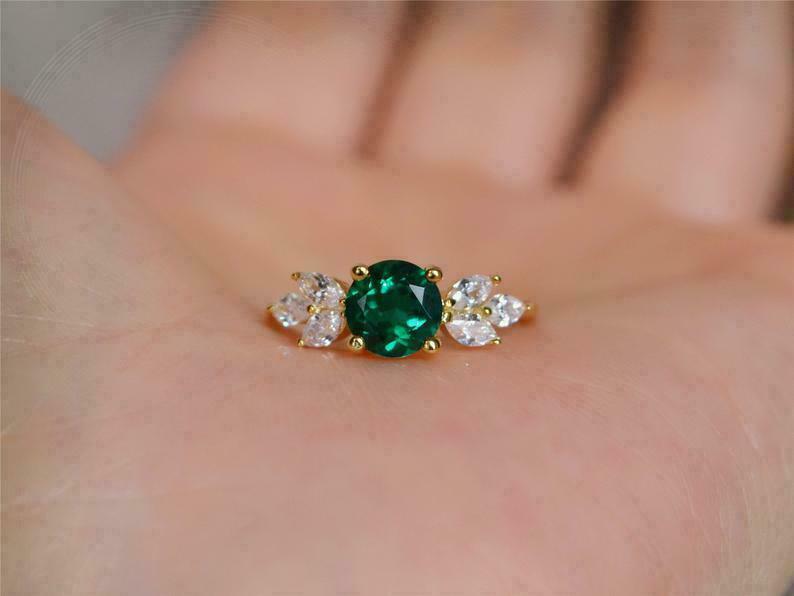 2Ct Rund Schliff Grün Smaragd Marquise Blatt Akzent Ring 14k Gelbgold Finish