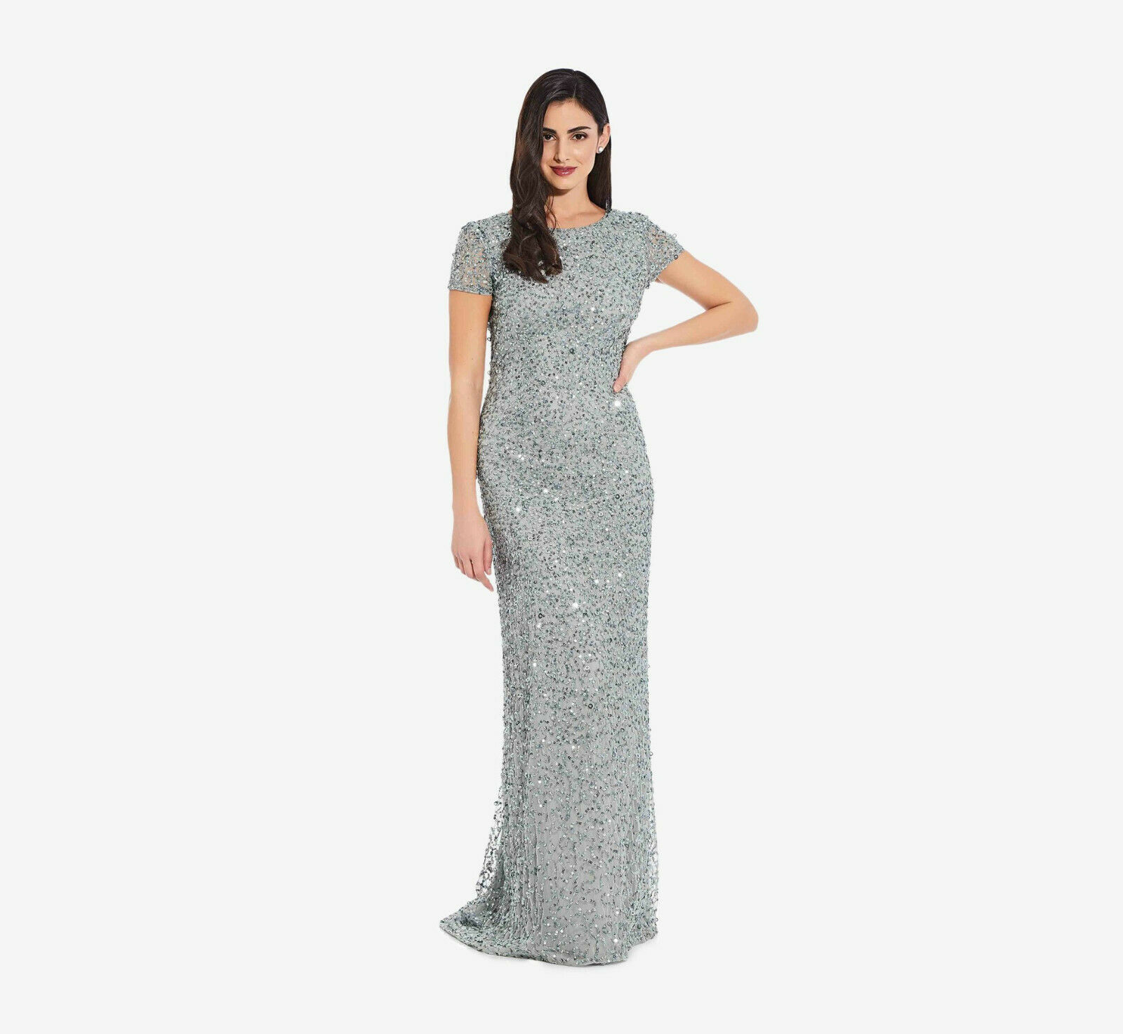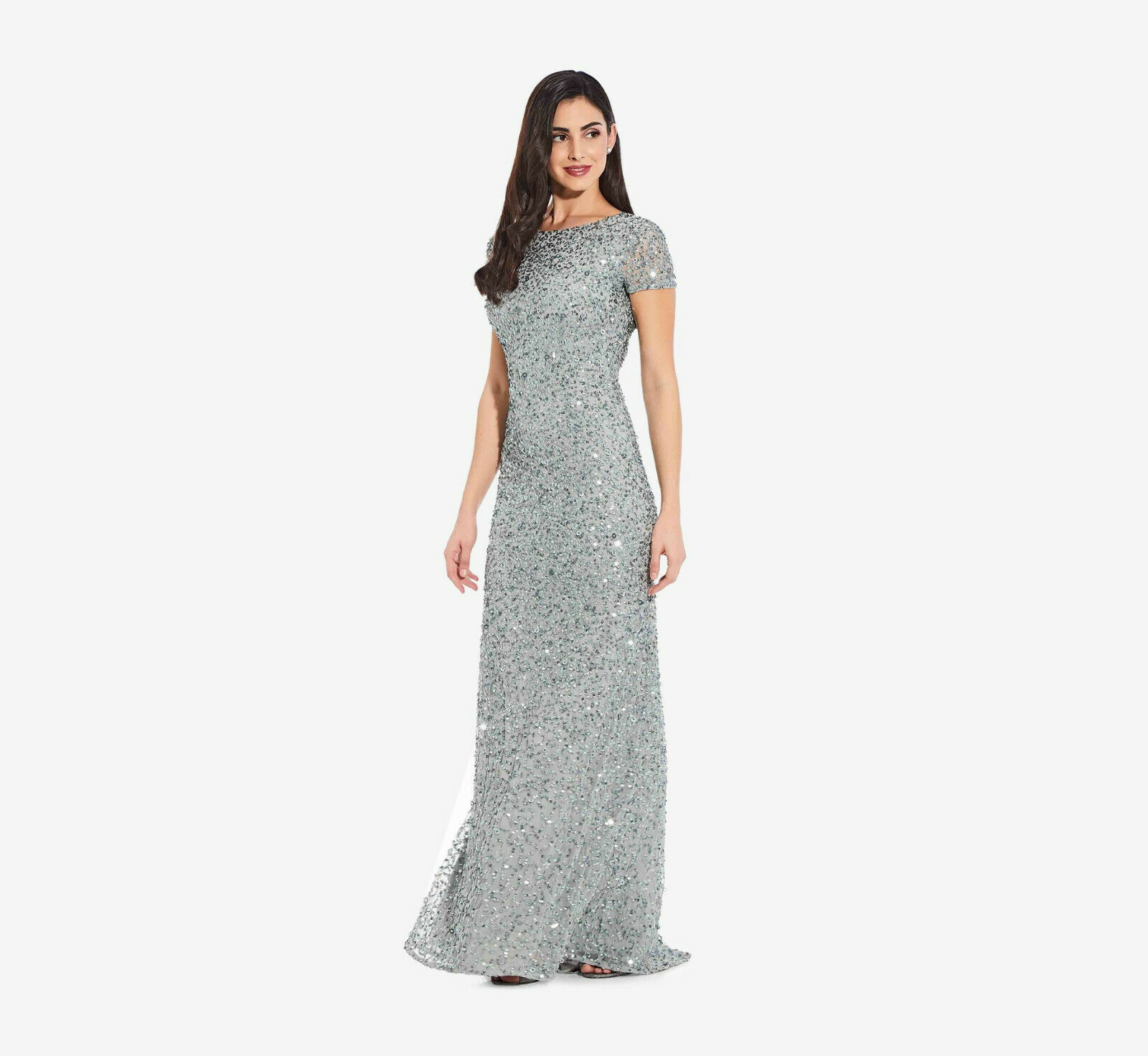 Adrianna Papell Scoop Back Sequin Gown With Short Sleeves in Frosted Sage 10