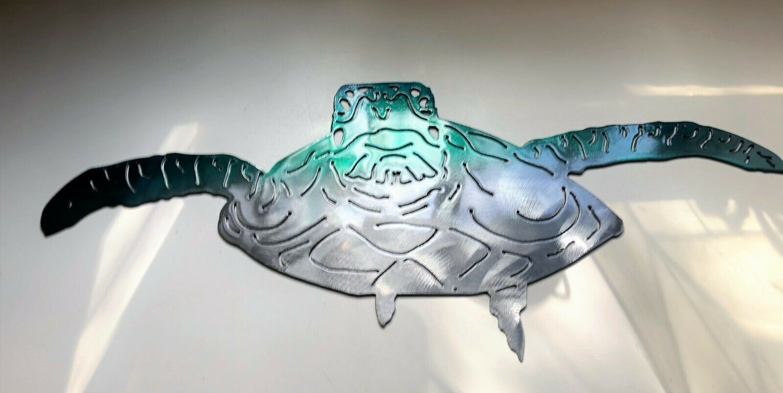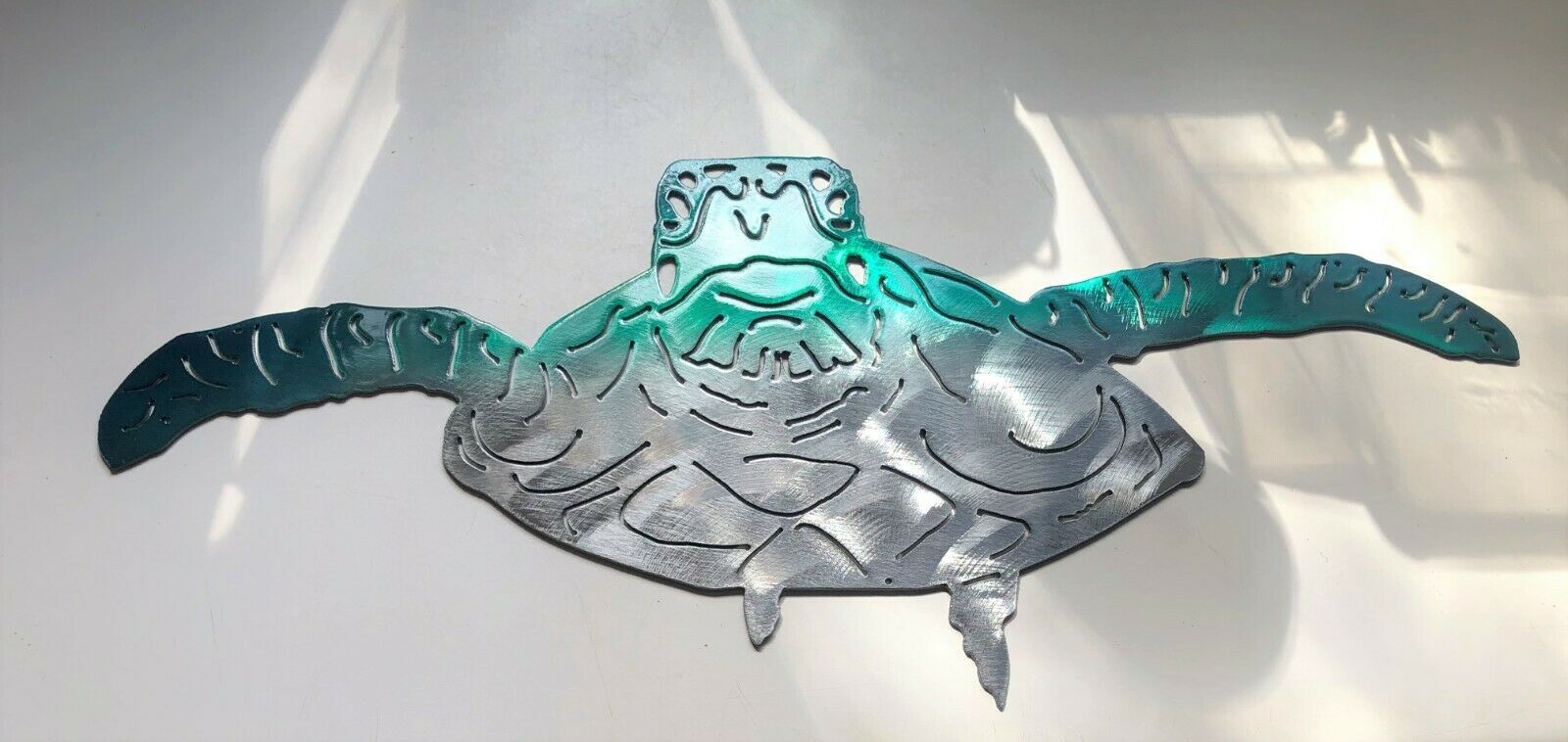 Forward Swimming Sea Turtle Metal Decor teal tinged
