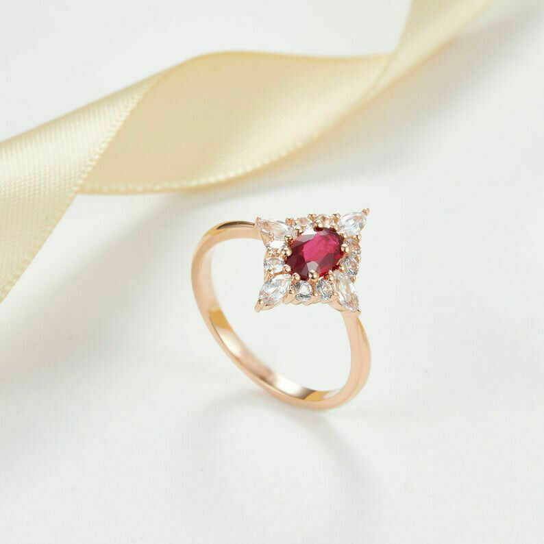 1ct Taglio Rosa Ovale Rubino Fidanzamento Anello Grappolo Diamante Halo 14k Oro
