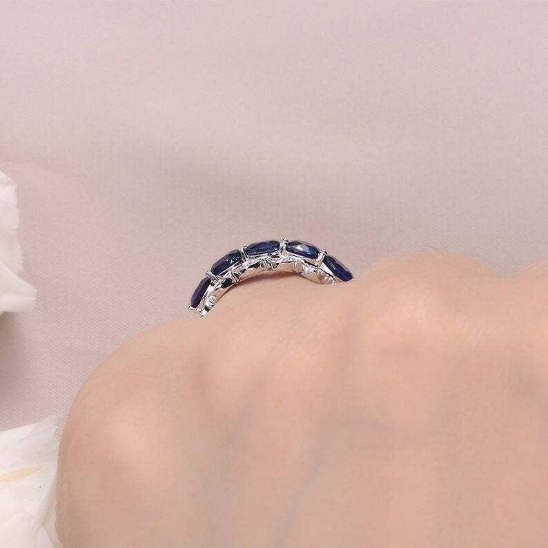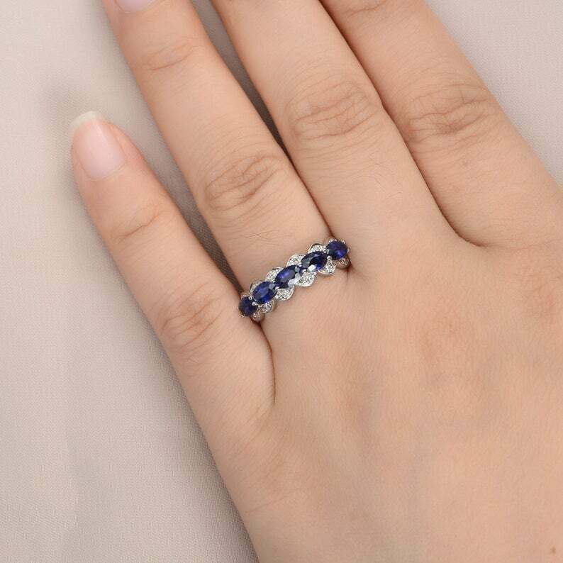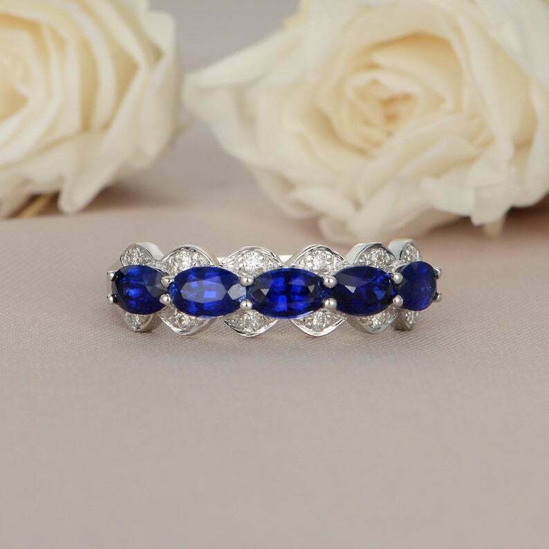 1.50Ct Corte Ovalado Zafiro Azul Media Eternidad Alianza 14K Oro Blanco Acabado