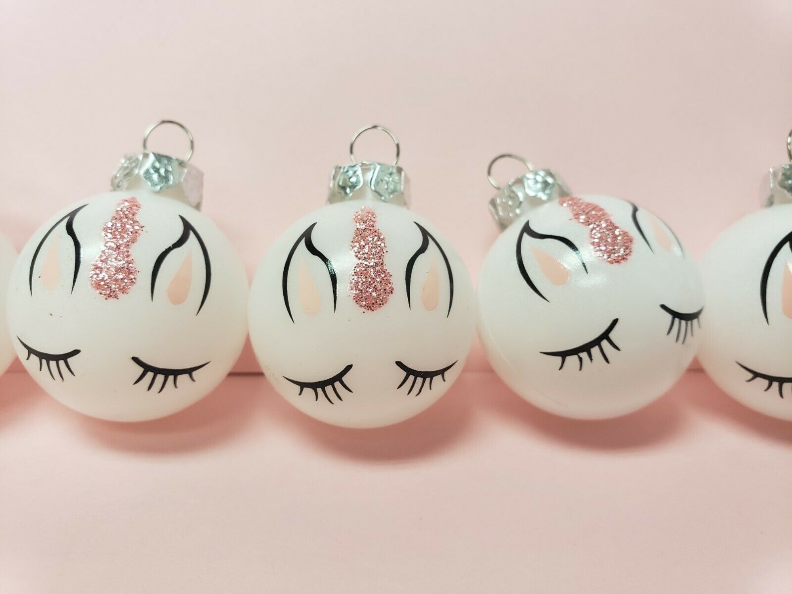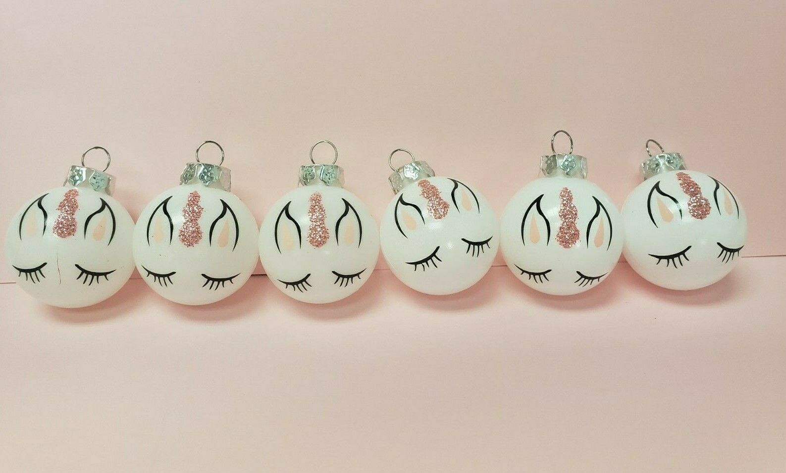 MINI ornaments. Up for sale are these adorable mini unicorn ornaments for your mini Christmas tree. Ornaments are sooo cute there white with black and pink (the unicorn horn is pink glitter) These measure approx just a little over 1.25" (not including silver round tip). These are new never used without there box. So pretty!! I do have some baby pink ornaments that would match perfect with these and combine them together.