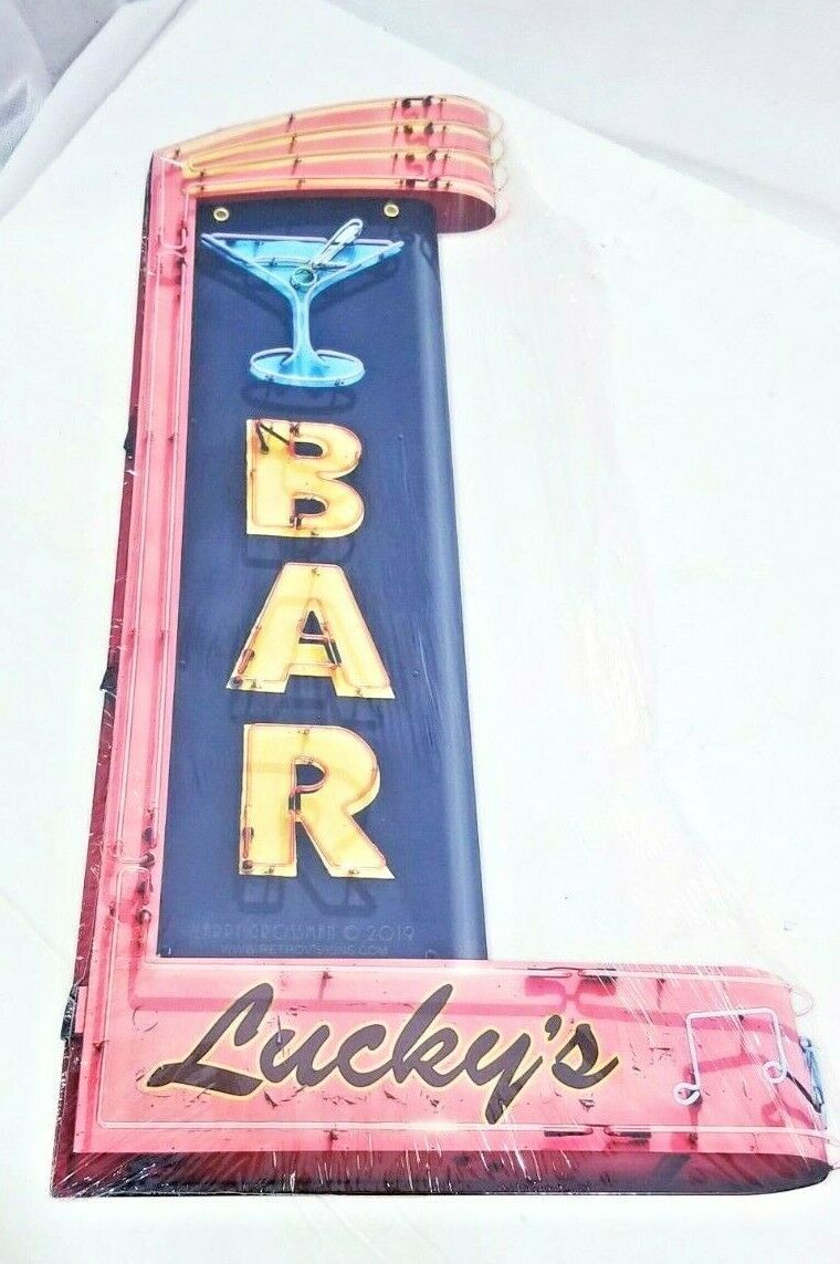 Brand new sealed. 18" Retro Lucky's Bar Neon style sign in USA STEEL Metal Neon Style Sign NEW with retro styling. This metal sign measures 18" H x 10" W and weighs in at 3 lb(s). Hand made in the USA using heavy gauge American steel. This metal print is made to last and make great gifts for any occasion. This bright colored non led metal sign has almost a 3D quality and is drilled and riveted for easy hanging. Make any wall pop with color.