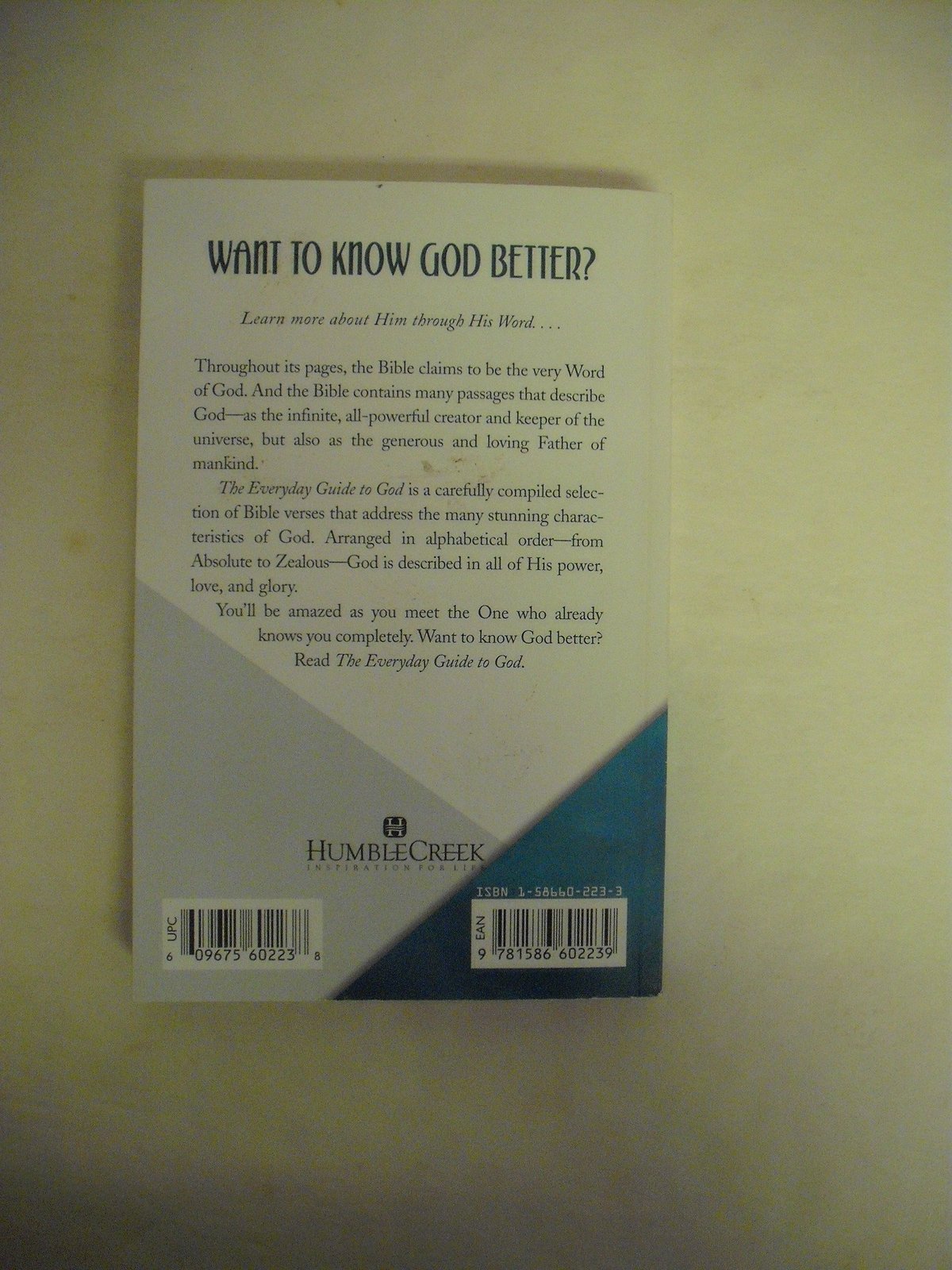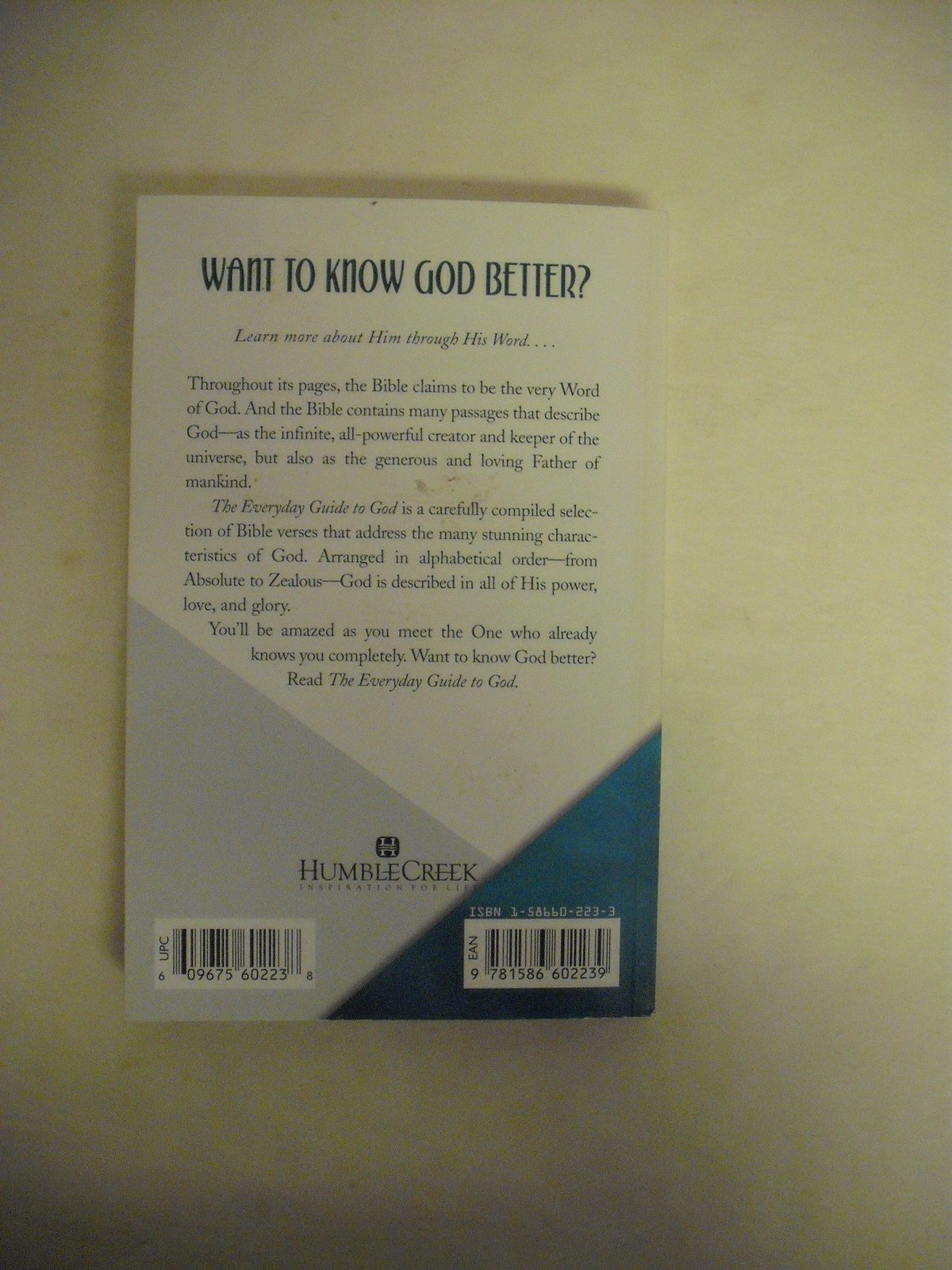 Product description: Throughout its pages, the Bible claims to be the very Word of God. And the Bible contains many passages that describe God - as the infinite, all-powerful creator and keeper of the universe, but also as the generous and loving Father of mankind. The Everyday Guide To God is a carefully compiled selection of Bible verses that address the many stunning characteristics of God. Arranged in alphabetical order - from Absolute to Zealous - God is described in all of His power, love, and glory. You'll be amazed as you meet the One who already knows you completely. Want to know God better? Read The Everyday Guide To God.