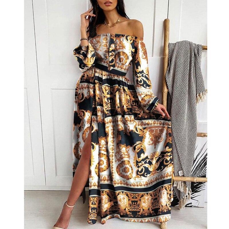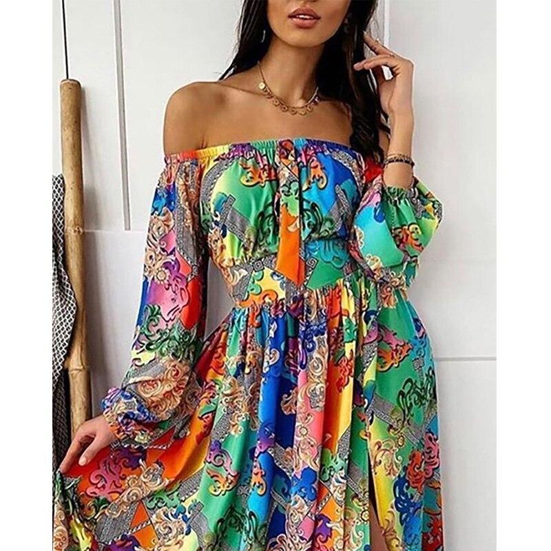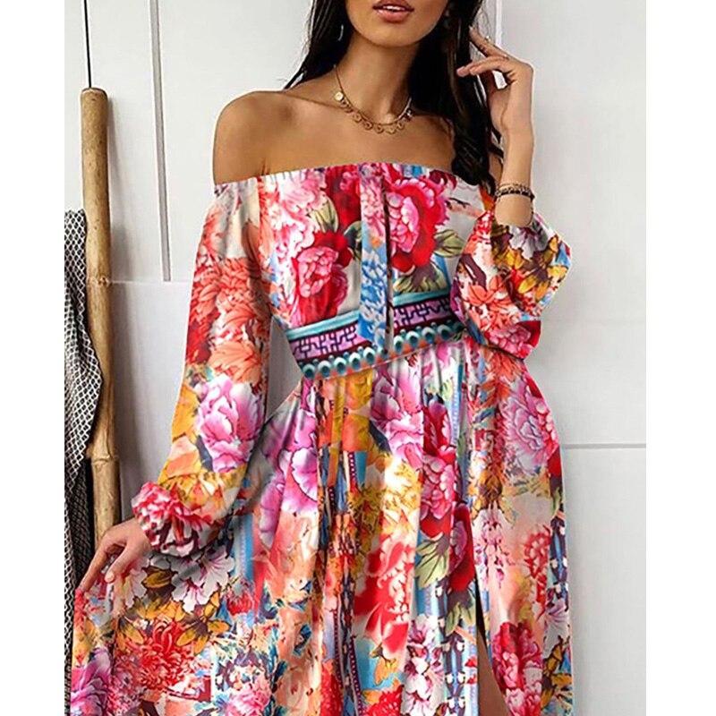 Boho Floral Off Shoulder Colorful Slit Maxi Dress