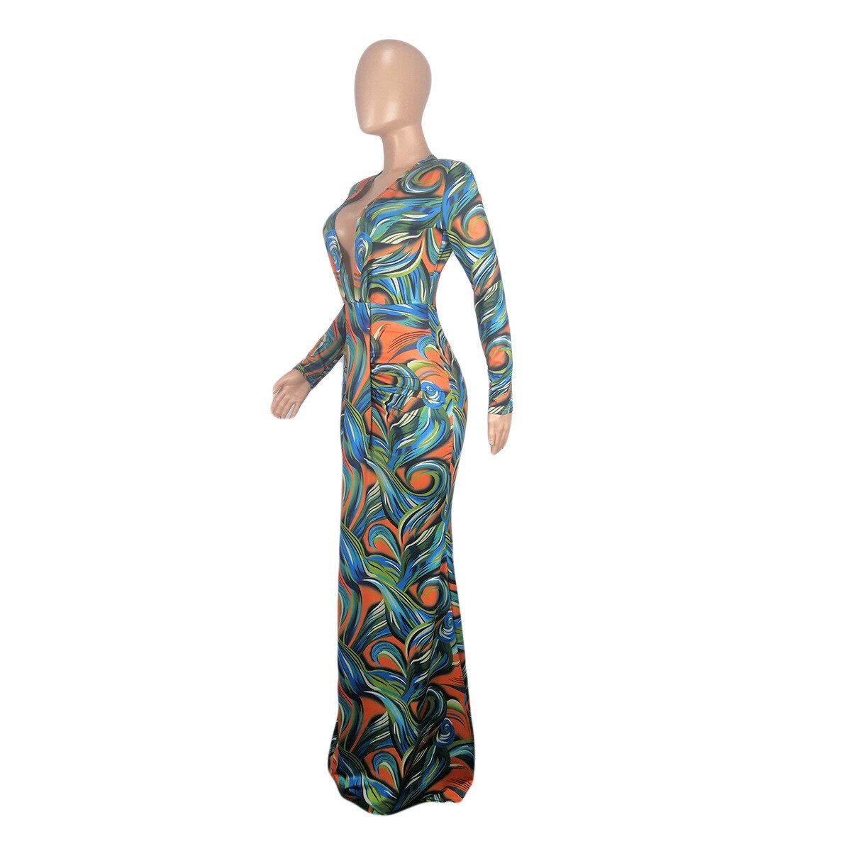 Long Sleeve V Neck Chic Printed Maxi Dress