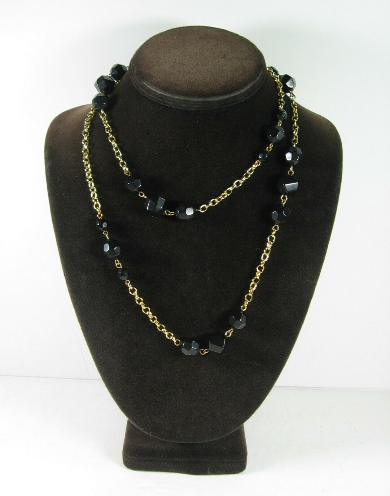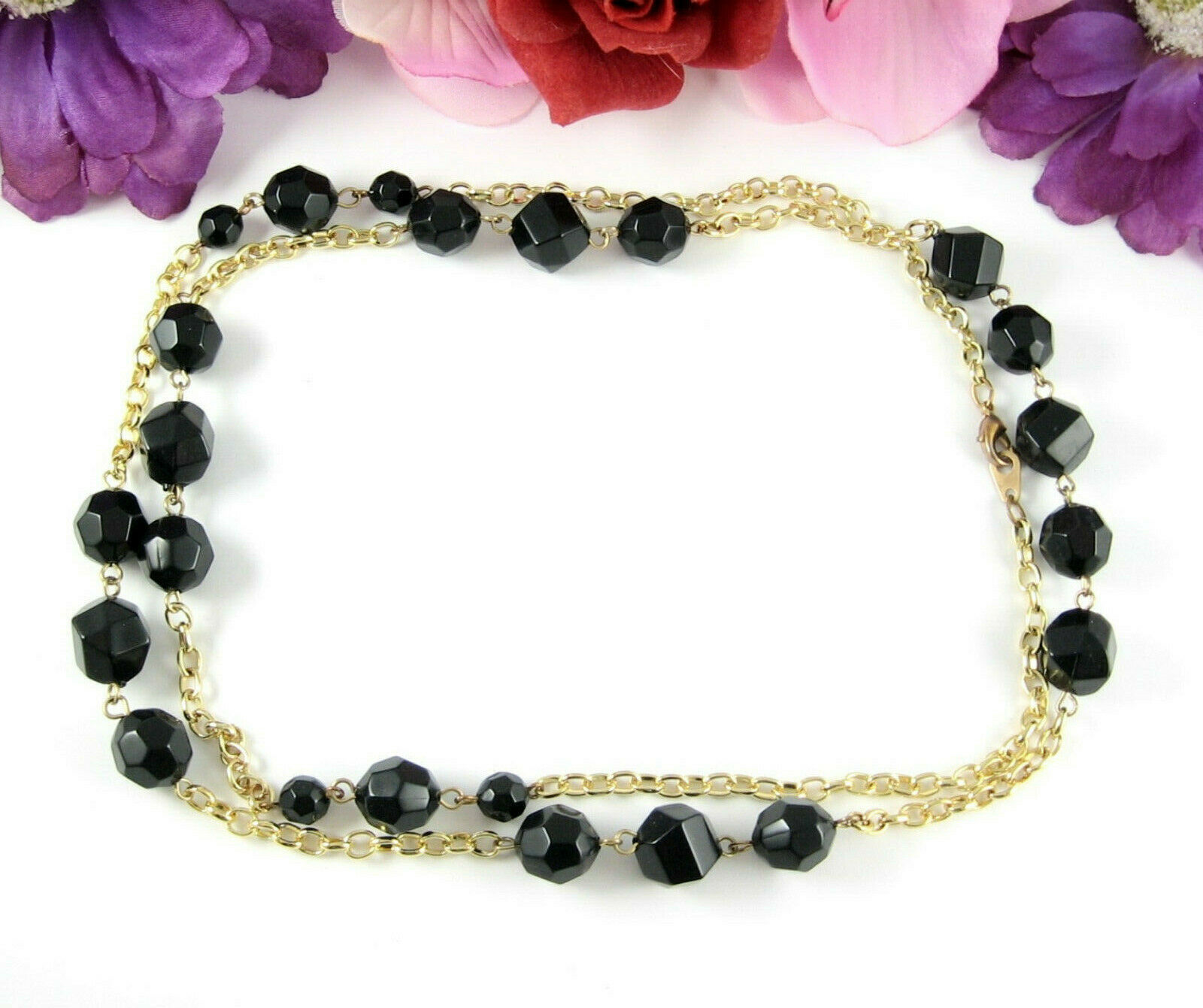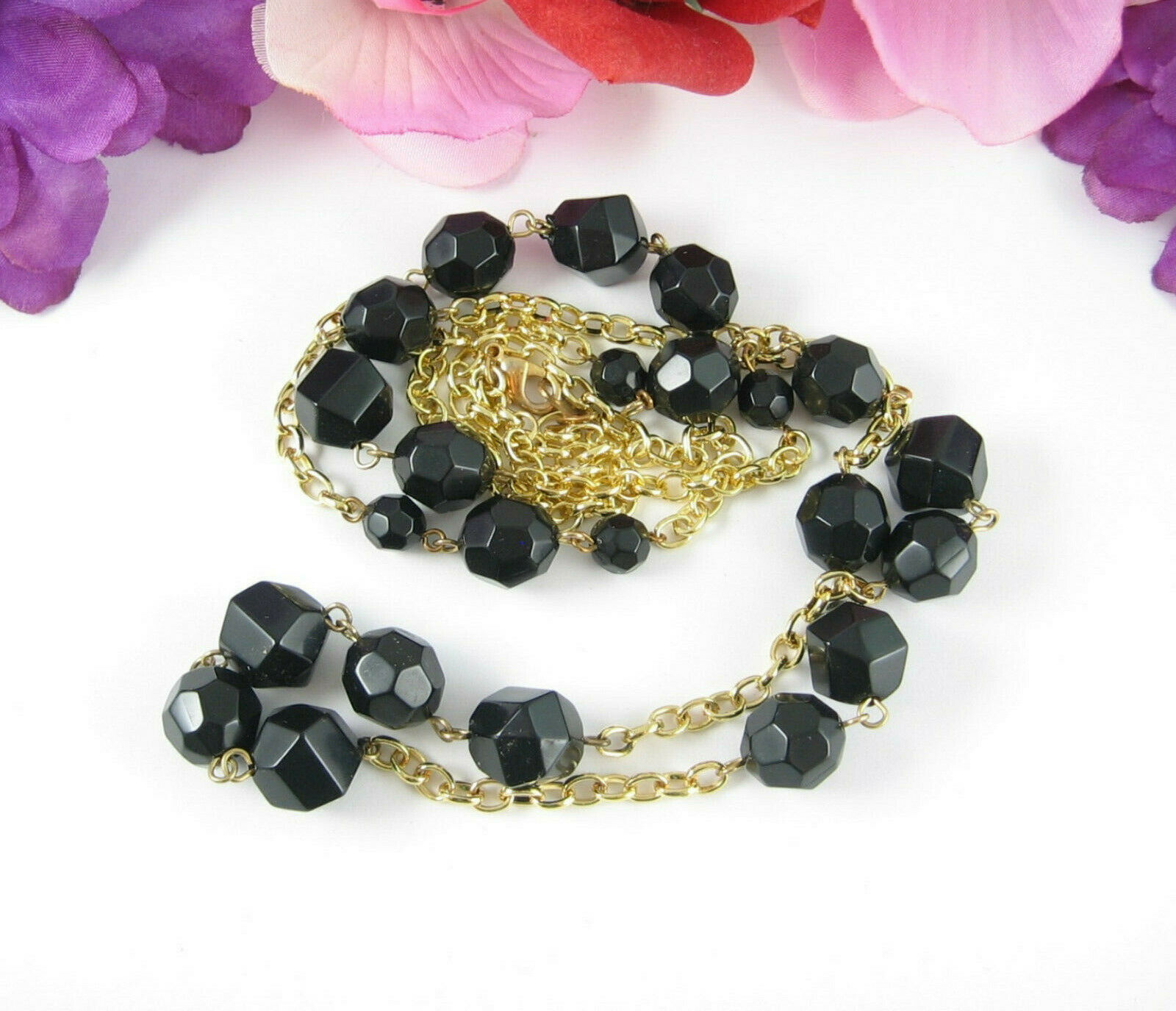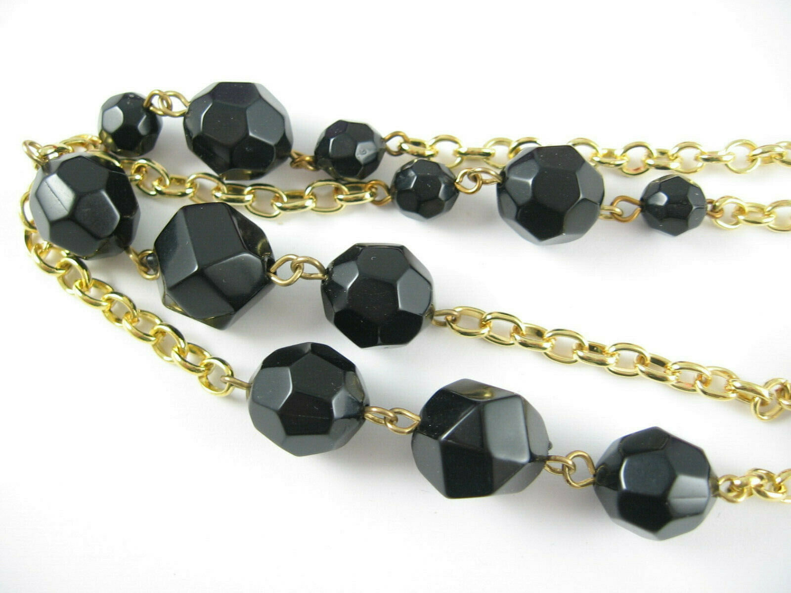 In a goldtone metal, this vintage NECKLACE has BLACK PLASTIC FACETED BEADS!