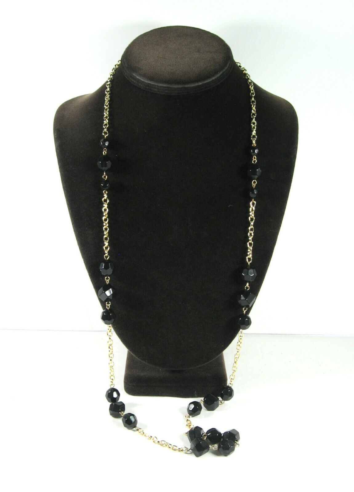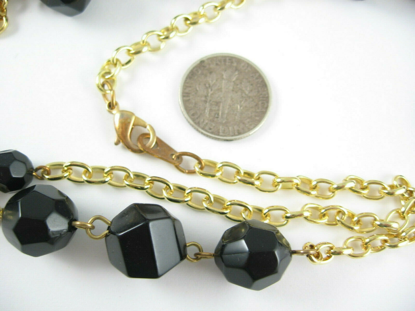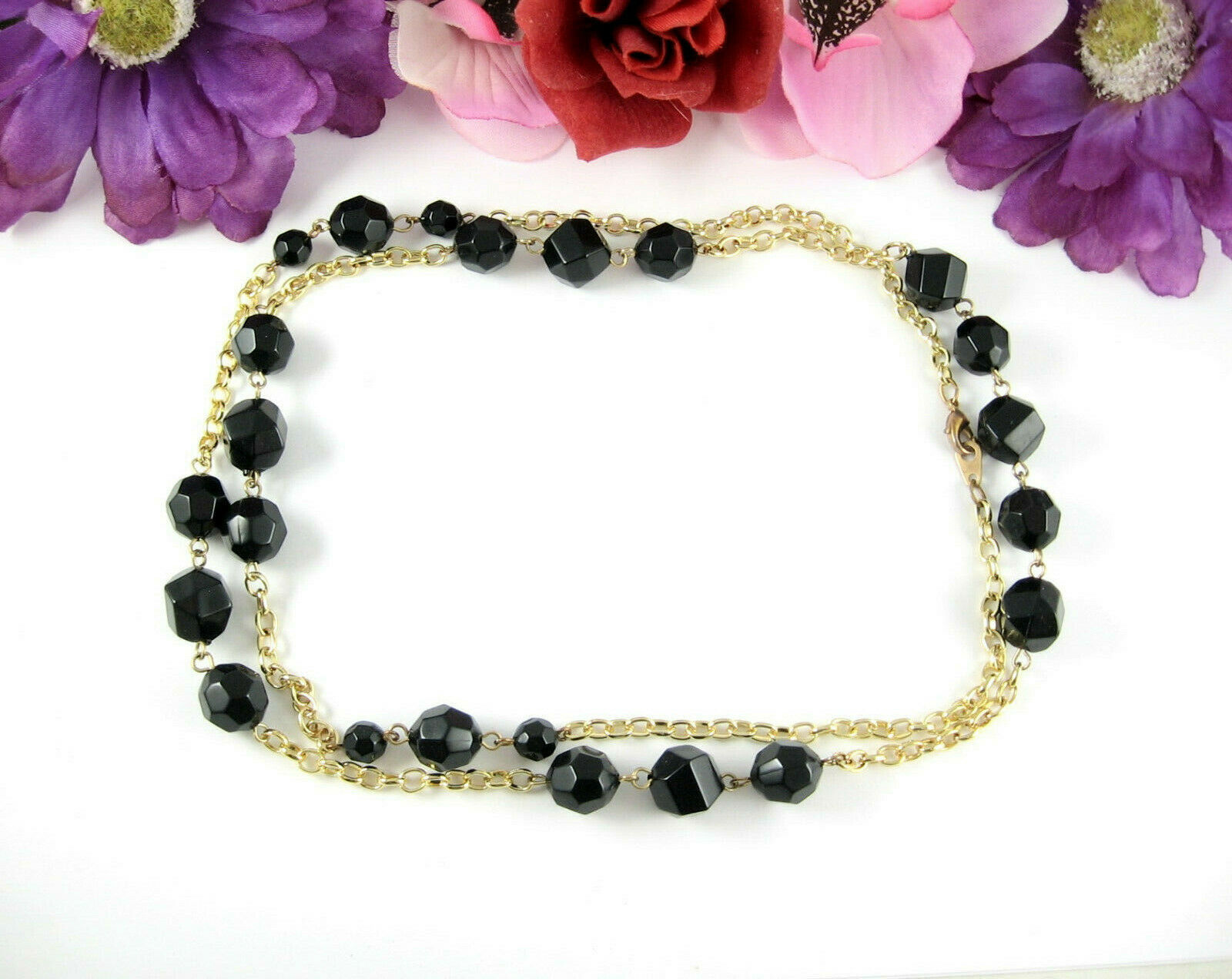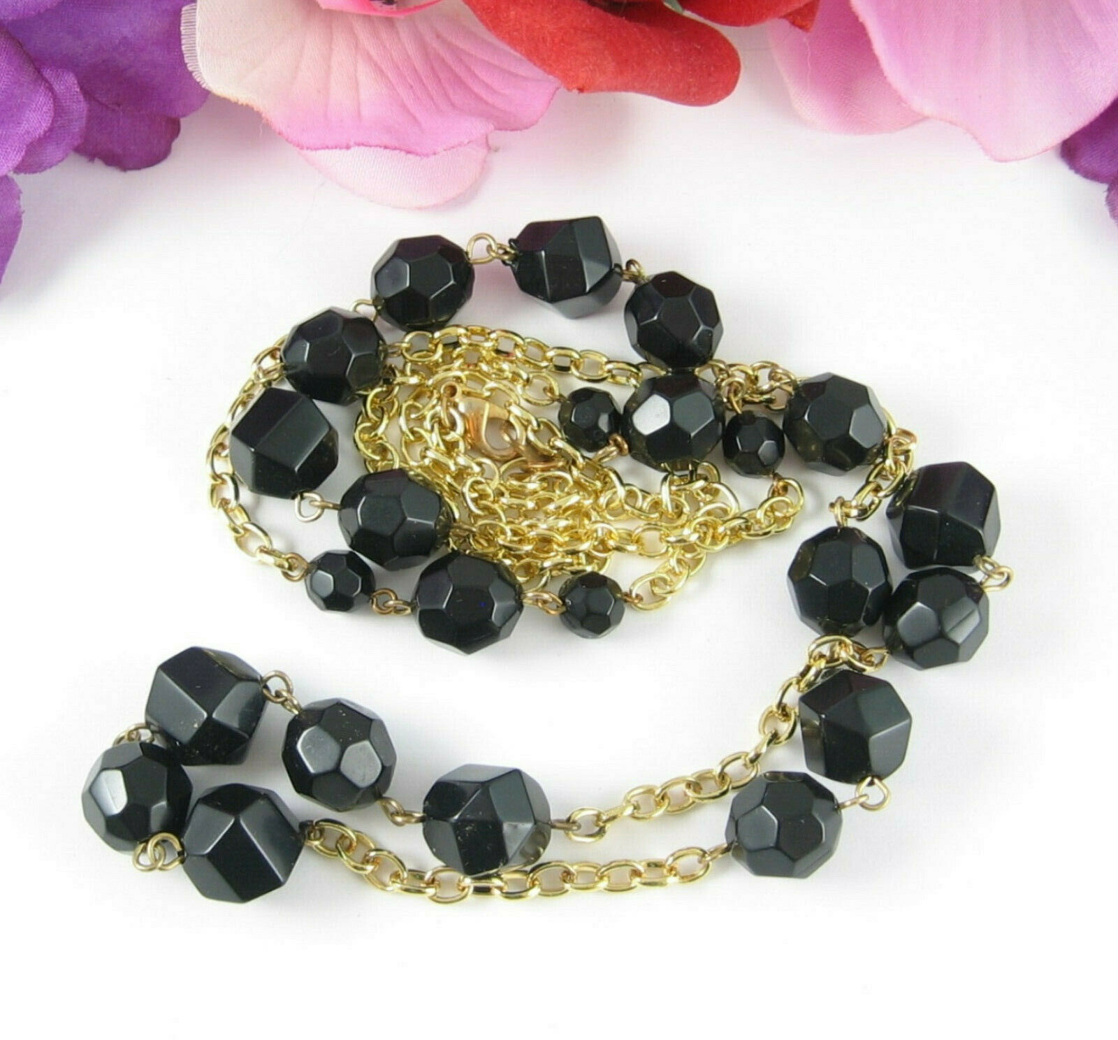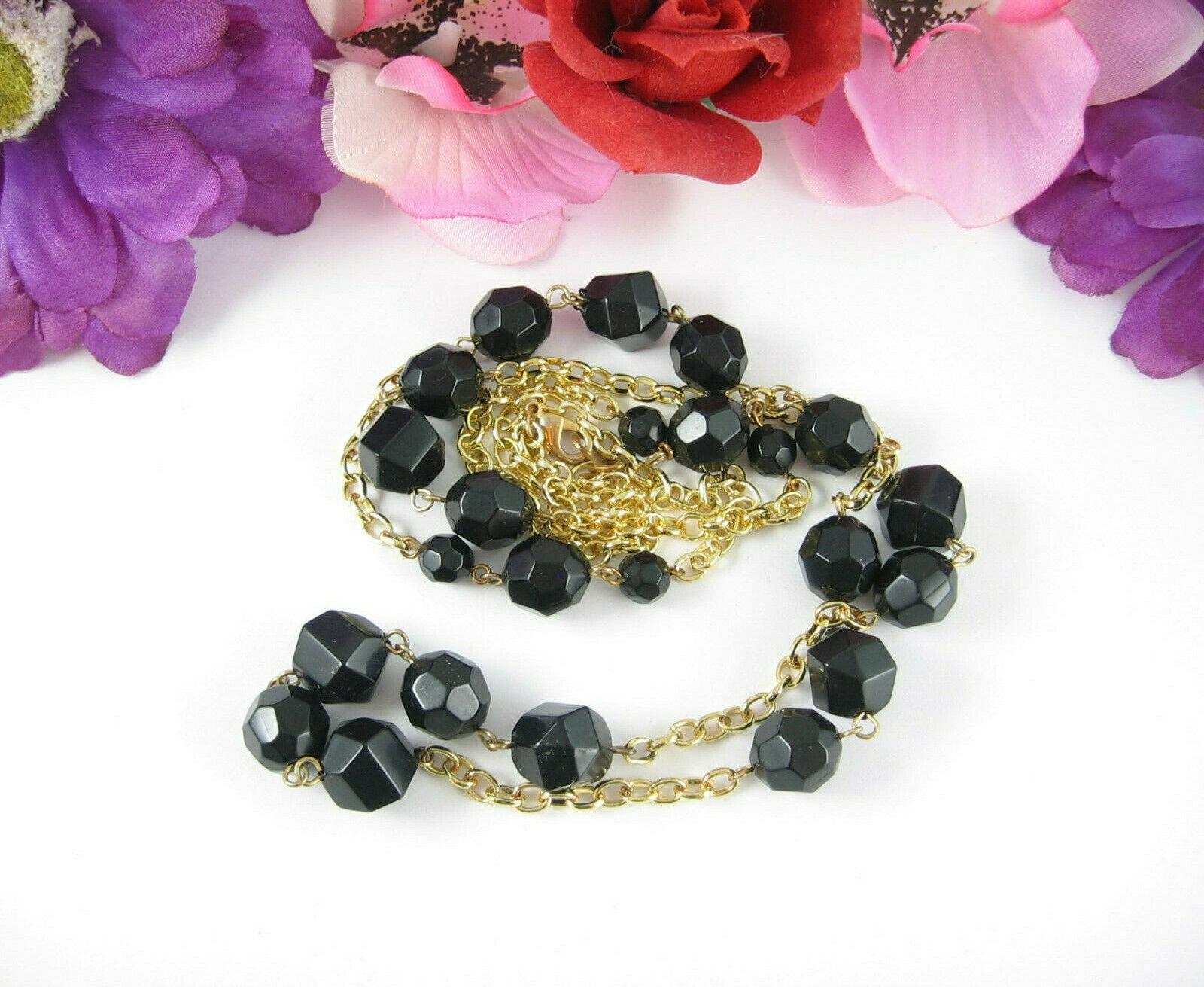 In a goldtone metal, this vintage NECKLACE has BLACK PLASTIC FACETED BEADS!