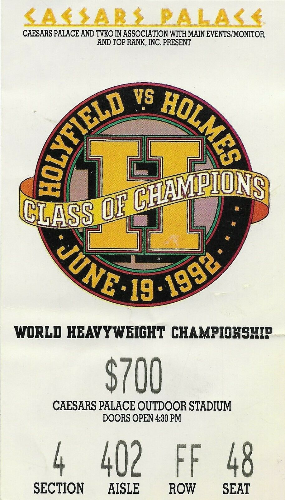 AUTHENTIC Evander Holyfield vs. Larry Holmes USED TICKET FROM June 19,1992 CAESARS PALACE IN LAS VEGAS, NV. THIS IS A MUST HAVE FOR ALL FANS OF EITHER FIGHTER OR BOXING FANS / COLLECTORS!!