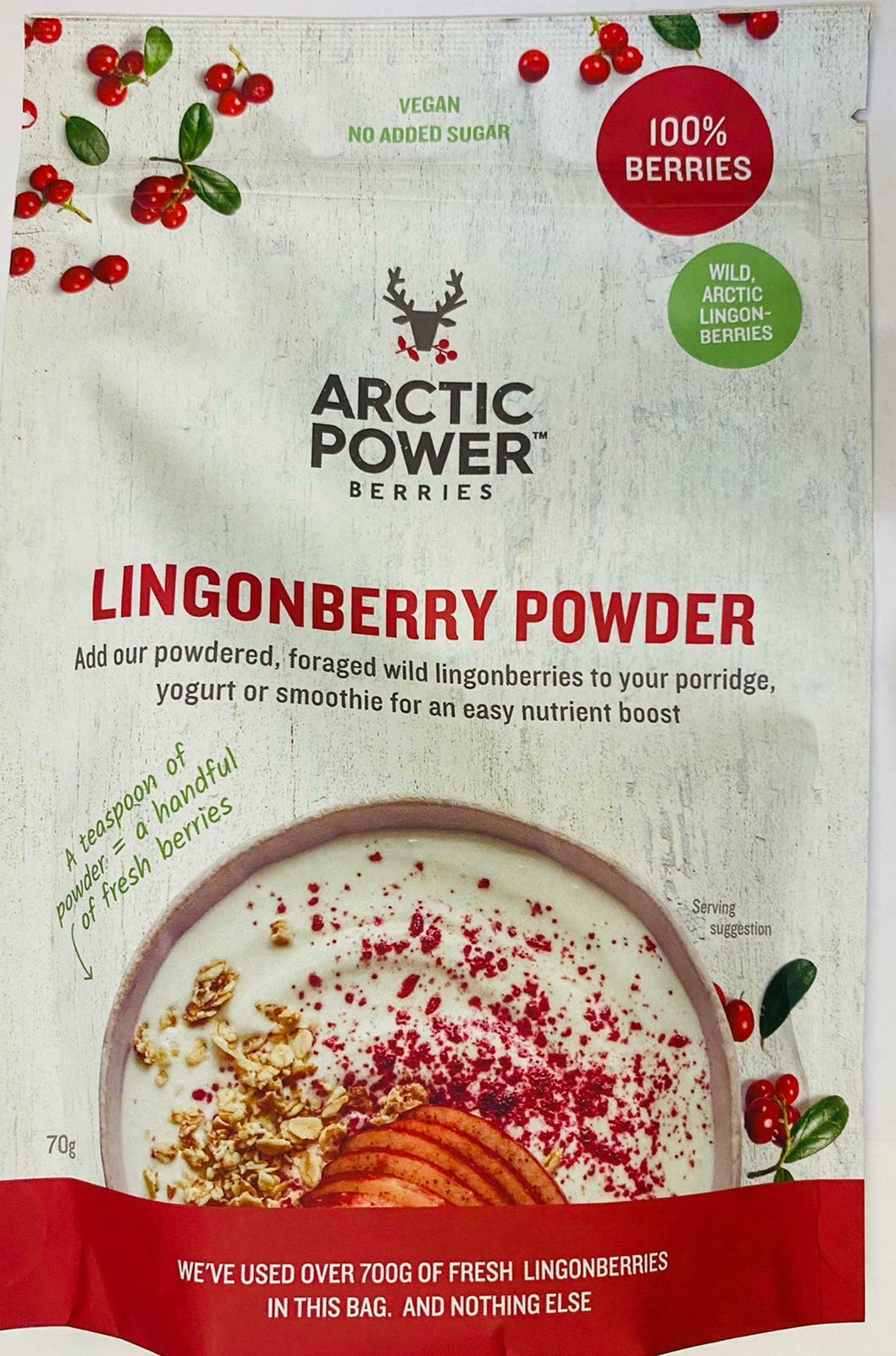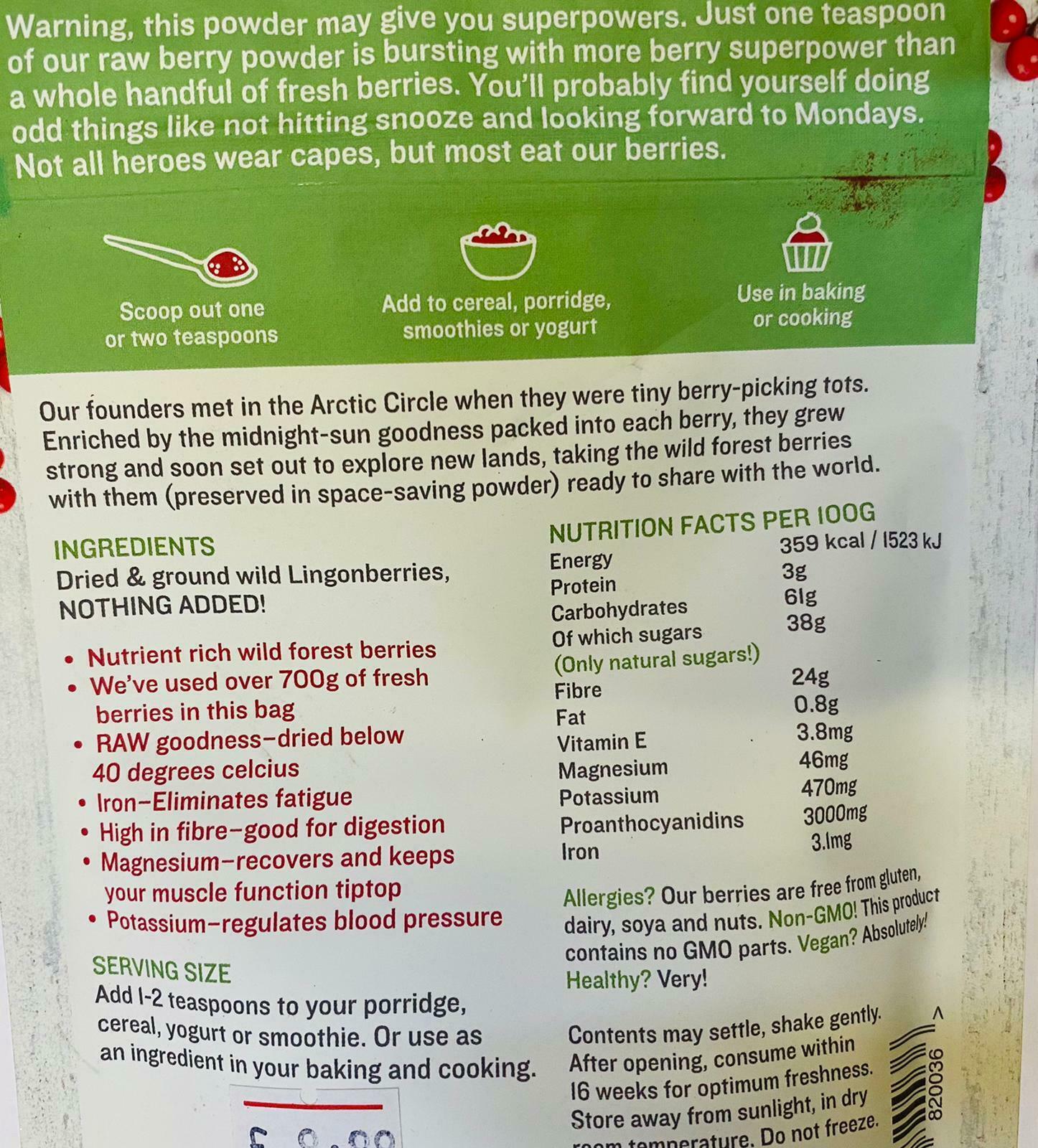 100% Pure Lingonberry powder, made with wild, hand-picked Arctic Lingonberries from clean, unpolluted nature of Finland. Nothing added!