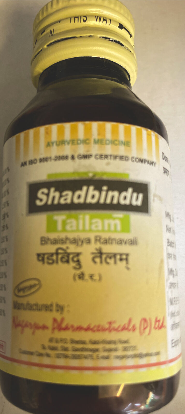 Shadbindu Tail (Oil) is herbal and ayurvedic medicated oil used for sinusitis and sinus infections. It is one of the famous Nasya Oils used in ayurveda. Shadbindu oil is a main medicine used in NASYA Panchakarma Therapy. It is also useful in the treatment of septal deviations or turbinate hypertrophy.