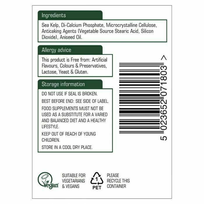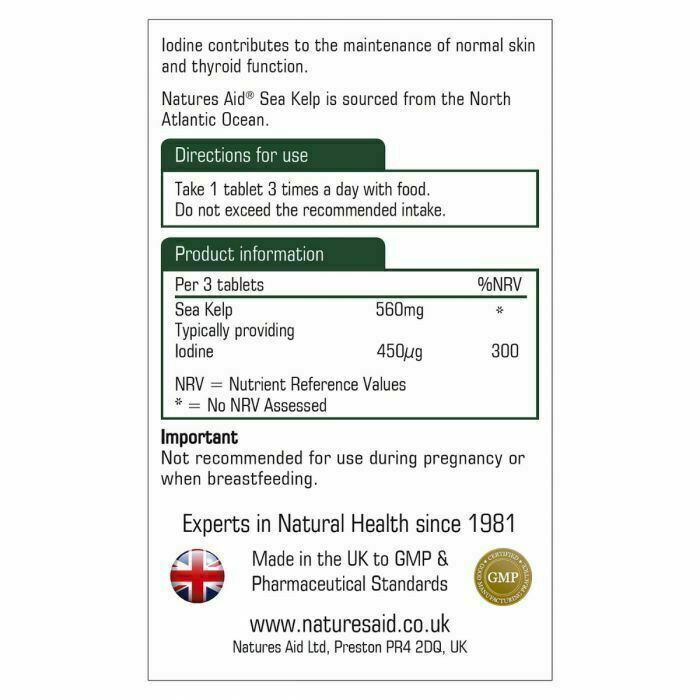 About this product Natures Aid Sea Kelp tablets are a fantastic source of Iodine – providing 450ug of Iodine per daily dose. This is equivalent to 300% NRV. Iodine is an important mineral element which has many beneficial effects, including: the maintenance of normal skin; and the maintenance of normal thyroid function. Natures Aid Sea Kelp is sourced from the North Atlantic Ocean. Product Information More InformationCategories Herbal (Botanicals), Beauty and Anti-Ageing, Metabolic Support and Vegan Status Hard Round Tablet Form Pack Size 10mm diameter round tablet Pack Size: 180 Dosage Instructions Take 1 tablet 3 times a day with food. Do not exceed the recommended intake. Age Restriction Suitable for all ages but it is advised to reduce dosage according to age and weight. Packaging 120ml Green PET bottle EFSA approved claims Iodine contributes to normal cognitive function Iodine contributes to normal energy-yielding metabolism Iodine contributes to the normal production of thyroid hormones and normal thyroid function