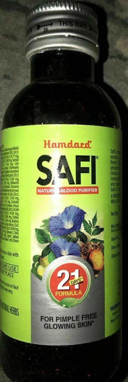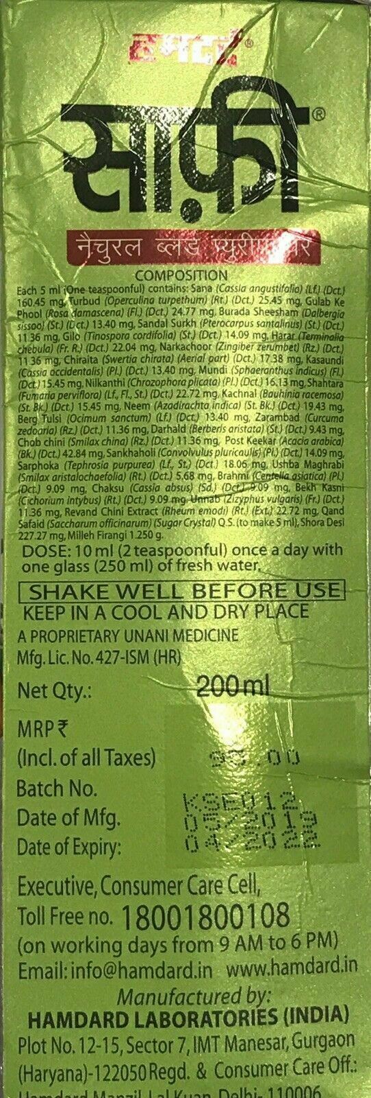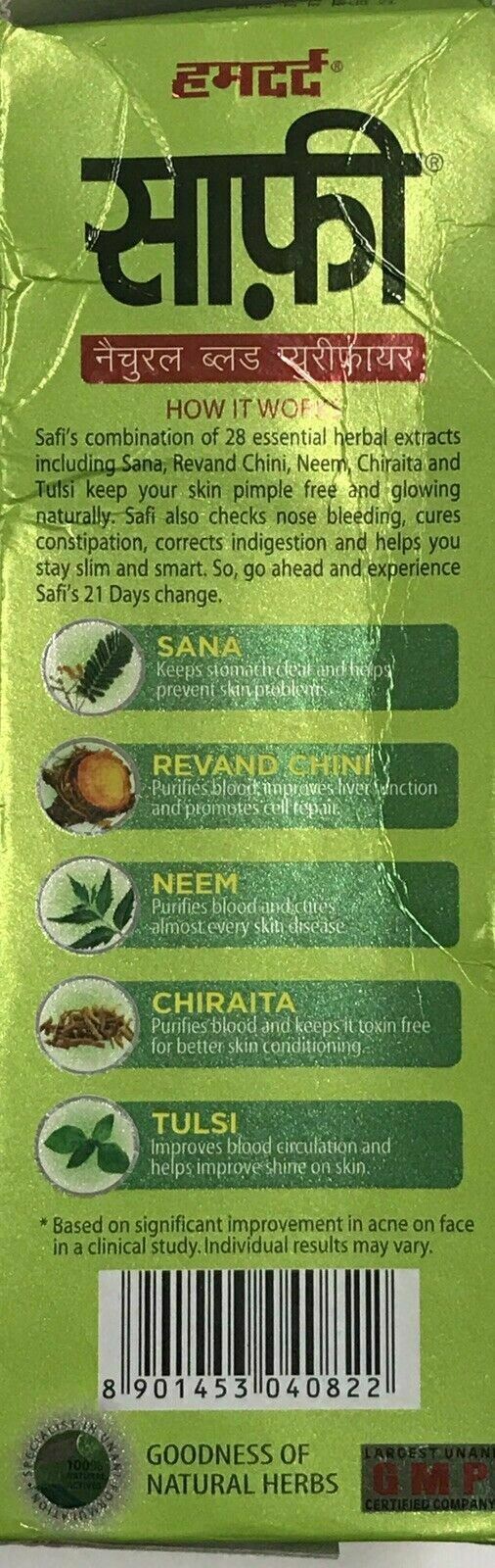 Hamdard safi is well known blood purifier remedy among Unani and herbal remedies Safi is a natural blood purifier. Safi purifies the blood from within by giving your liver, thyroid and the rest of your body the support they need and eliminating the toxins that usually cause acne and blemishes. Safis blend of essential herbal extracts keeps your skin pimple free and glowing. There is neem which purifies the blood and keeps it free from almost every skin disease. Chiraita keeps the skin toxin free while senna keeps the stomach clear and as a result your skin and tulsi which improves blood circulation and helps your skin shine. Taken regularly, Safi is an effective pimple fighter, healing the skin and making it look radiant naturally. Disclaimer *