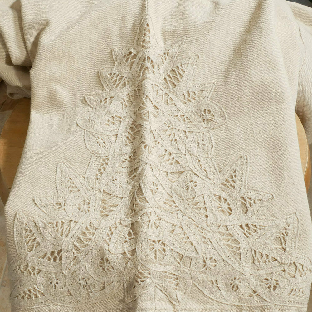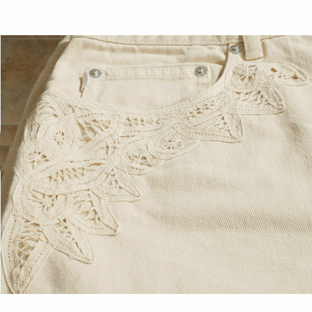 leg - 11" across hem, and tonal battenburg lace along the front pockets and 11.5" up the