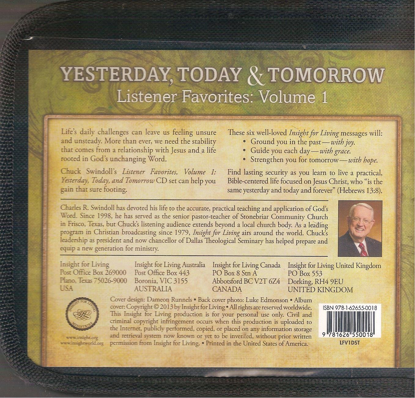 Product description: Three Perspectives for You Today Life?s daily challenges can leave us feeling unsure and unsteady. More than ever, we need the stability that comes from a relationship with Jesus and a life rooted in God?s unchanging Word. Chuck Swindoll?s Listener Favorites, Volume 1: Yesterday, Today, and Tomorrow CD set can help you gain that sure footing. These six most-requested Insight for Living messages from the last year will: Ground you in the past?with joy. Guide you each day?with grace. Strengthen you for tomorrow?with hope. Find lasting security as you learn to live a practical, Bible-centered life focused on Jesus Christ, who ?is the same yesterday and today and forever? (Hebrews 13:8). CD Set of 6 CDs Individual messages in this series: ?Philippians: Joy in Abundance? from the series God?s Masterwork, Volume 6 ?1 Peter: Hope for the Hurting? from the series God?s Masterwork, Volume 7 ?The Grace to Let Others Be? from the series The Grace Awakening ?A Marriage Oiled by Grace? from the series The Grace Awakening ?A Prophetic Collage? from the series Daniel, Volume 2: God?s Plan for the Future ?The Final World Dictator? from the series Daniel, Volume 2: God?s Plan for the Future