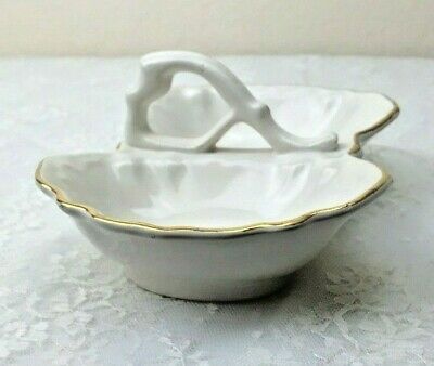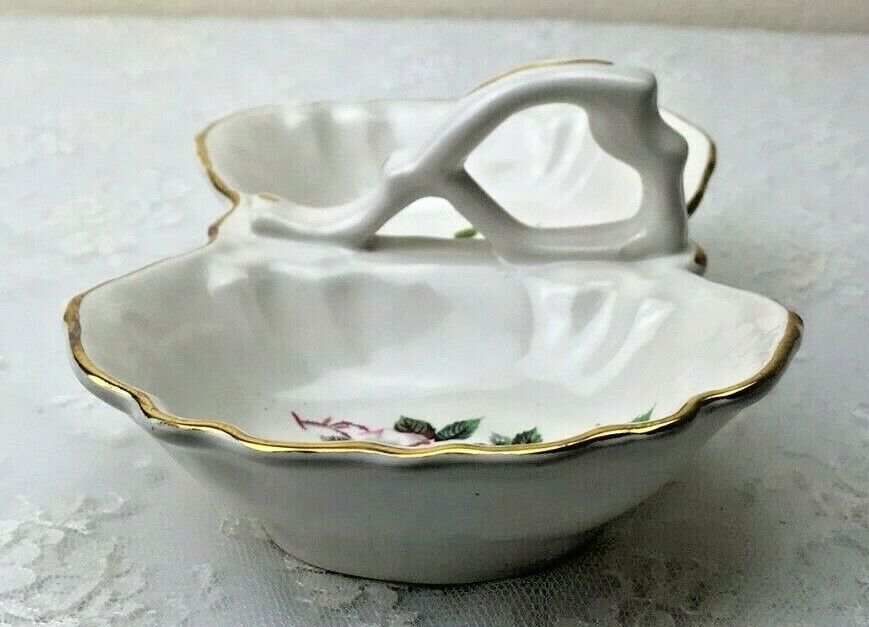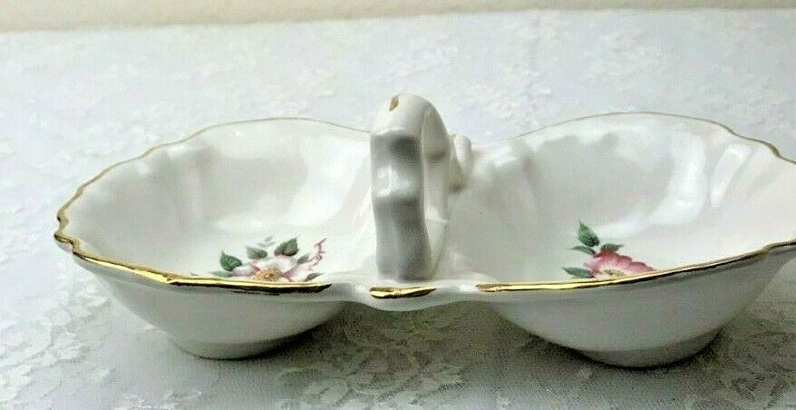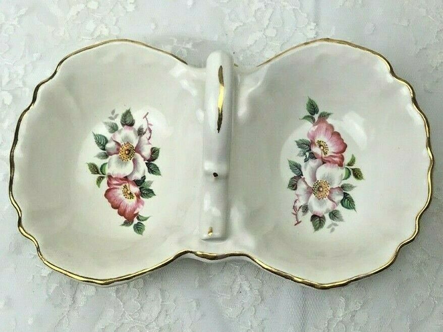 Double Sided Dish with Handle Dogwood Transferware Gold Trim 9" x 5.25" x 3". This beautiful double sided candy or condiment dish dates back to the late 1800โs - early 1900โs. The flowers on the inside of the bowls are dogwood blossoms. The bowl is trimmed in 24k gold. The makerโs mark is stamped on and not clear enough to read. Excellent Used Condition for itโs age - No Cracks or Chips - See Photos for further description