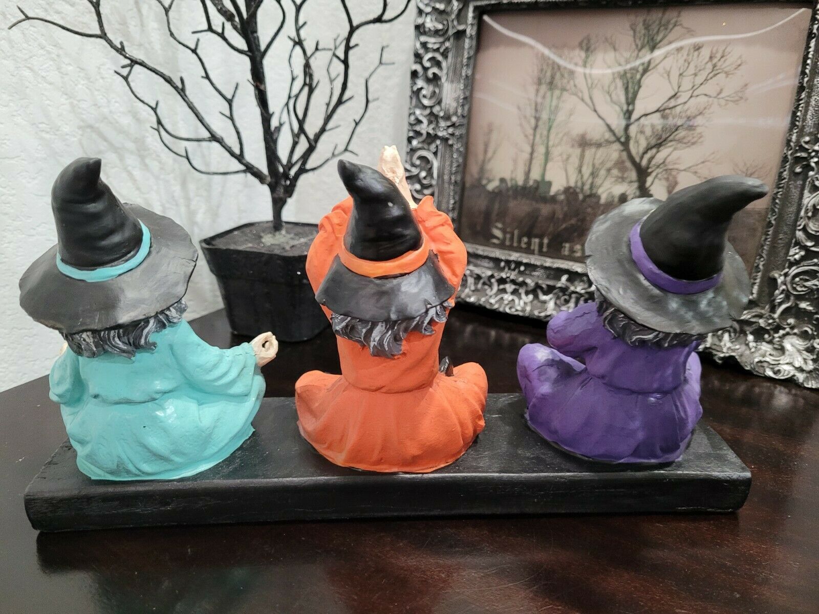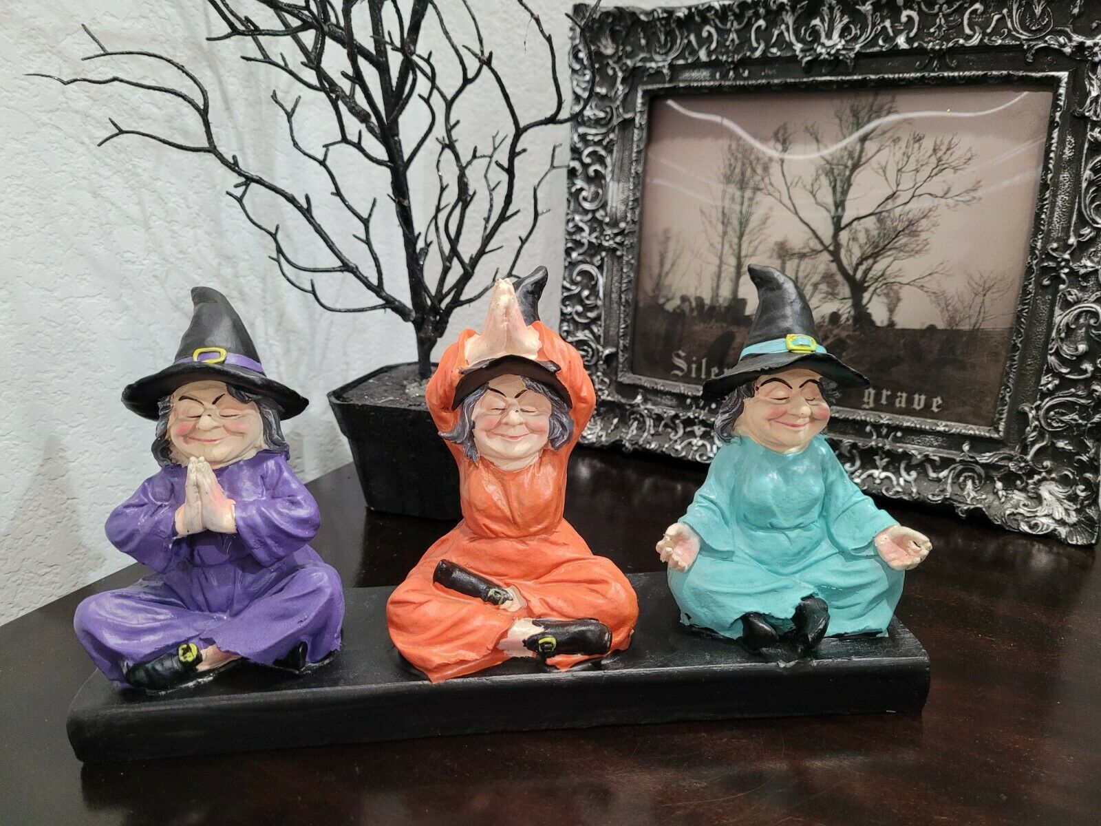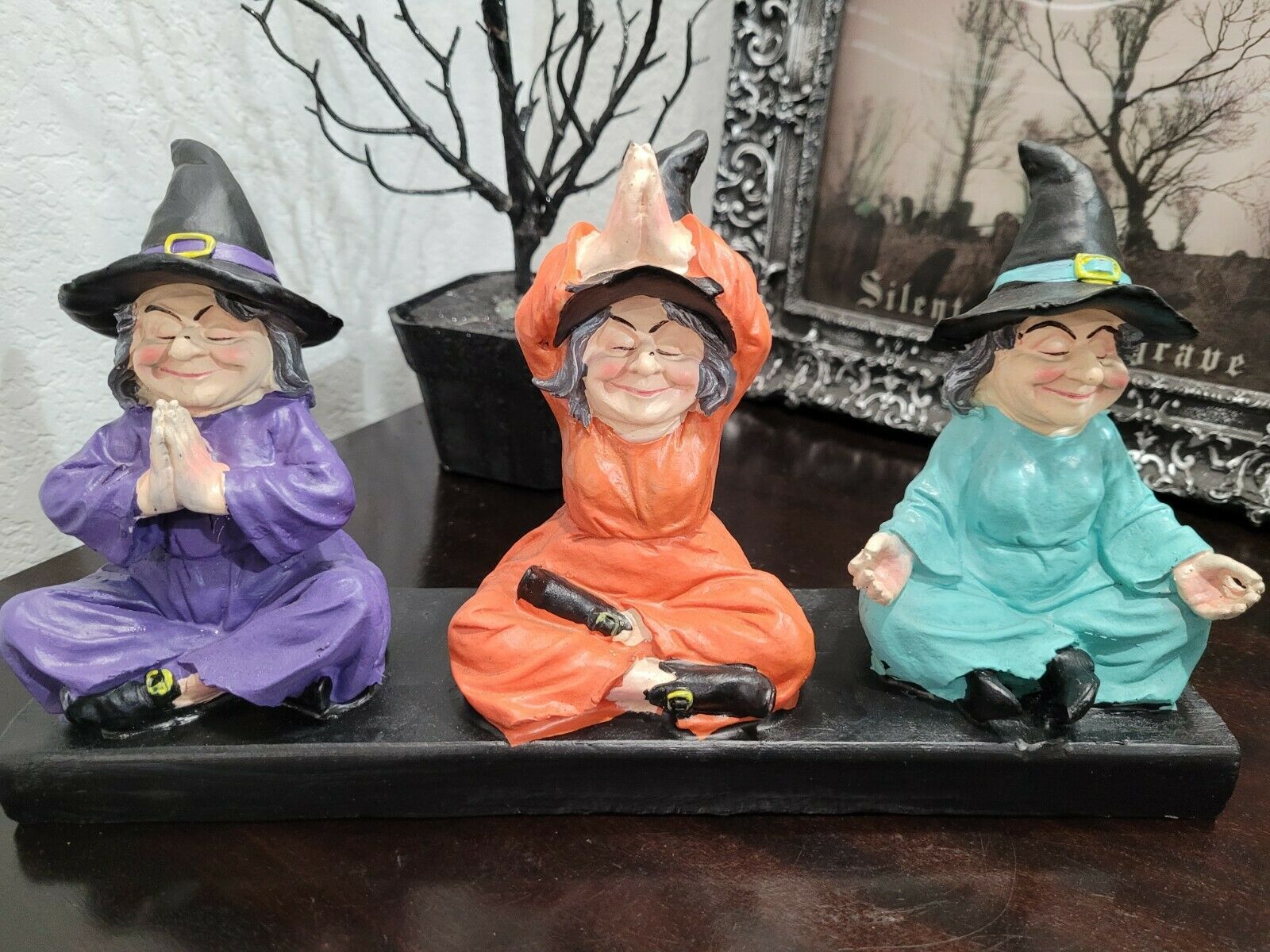 Up for sale is this adorable trio of witches doing there yoga!! This is such a cute piece and will look amazing along with your decor. Made of resin it's approx 12.75" wide x 6.5" tall. Soooo cute!! New.