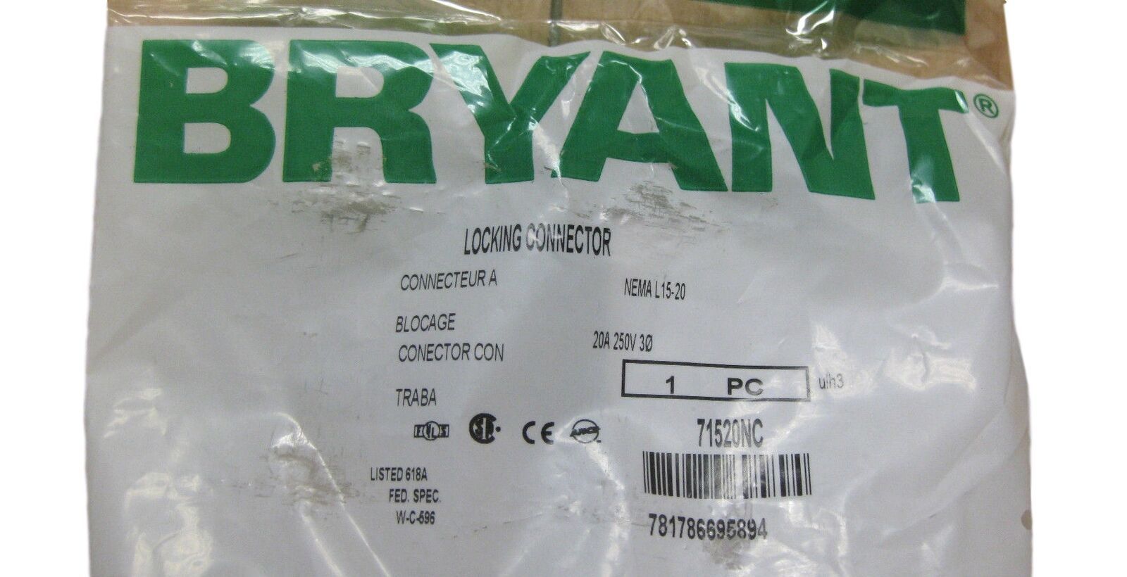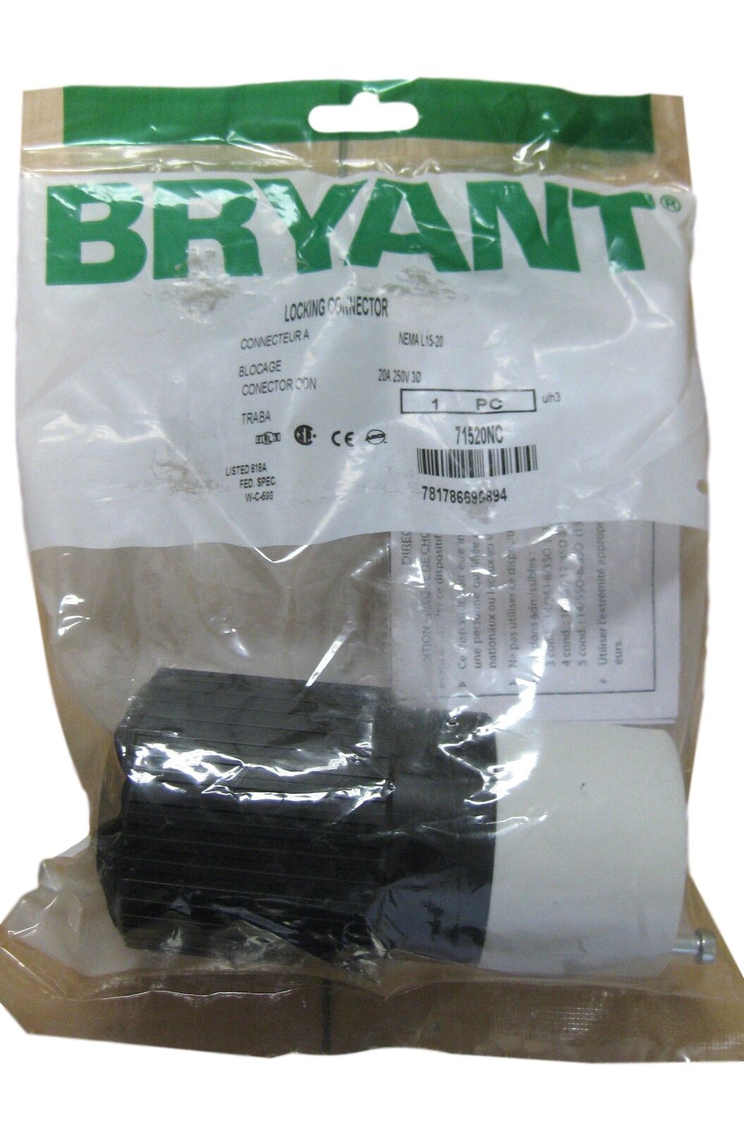 Hubbell Bryant 71520NC 250V Locking Plug & Connectors 20A 250V 30 NEMA L15-20