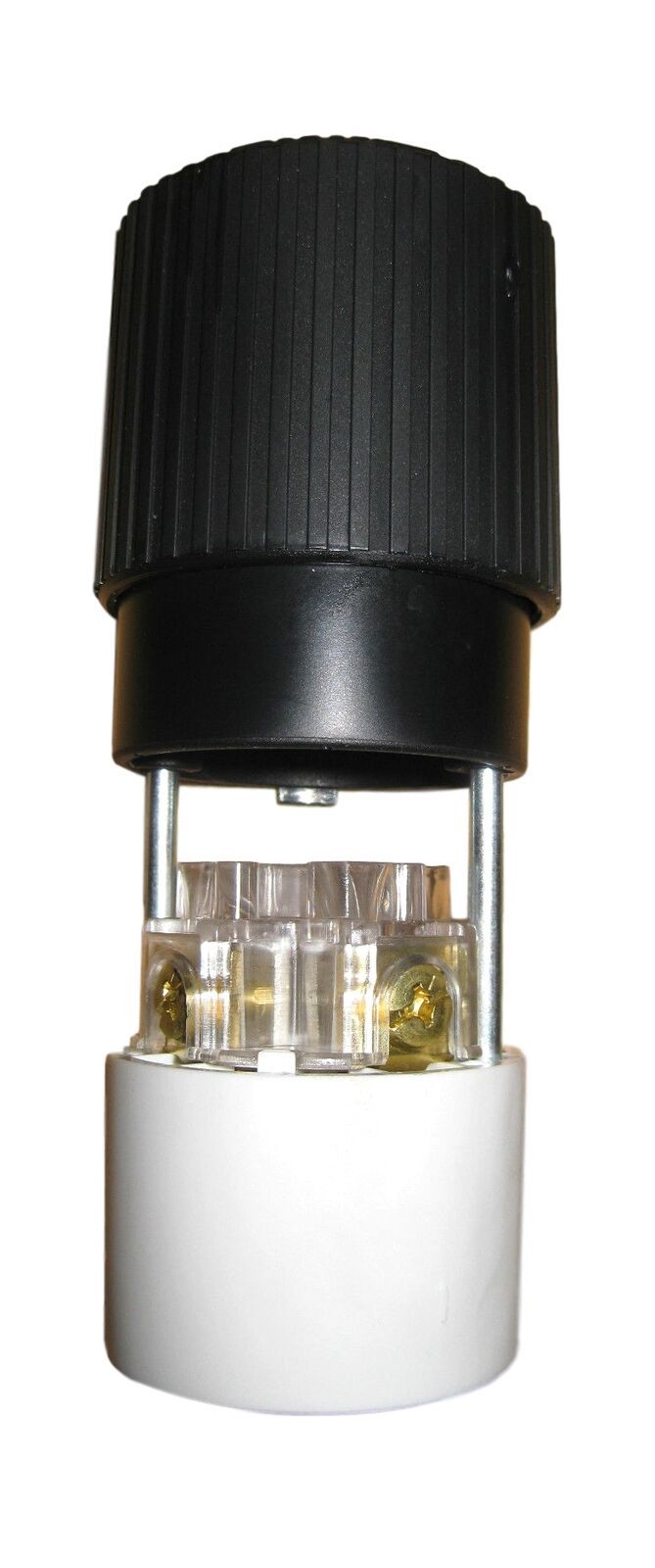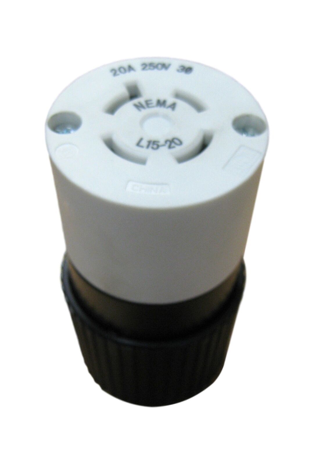Locking electrical connector, 20A, 250VAC, 3-pole, 4-wire, NEMA L15-20, internal self-centering cord clamp, accepts cord diameters 0.465 to 1.15 in. (11.8 to 29.2 mm), high-impact chemical-resistant black/white nylon housing, transparent terminal cover, quick-thread assembly screws, integrated thermoplastic elastomer dust seal.