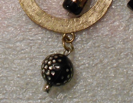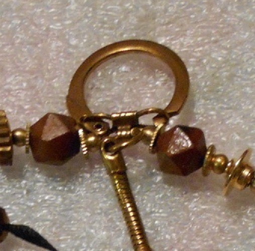 This is a unique one-of-a-kind keychain (or key ring) made by a local artist. The materials used include: Brass ring measuring over an inch, with gold-tone chain attaching onto the key ring. The charms are plastic and wooden beads and brass spacers, and the metal keyring is about an inch. Overall length is about 5 inches.