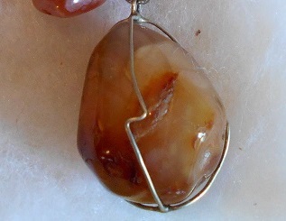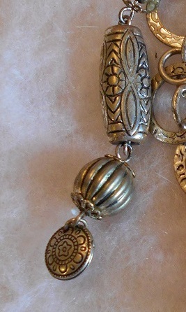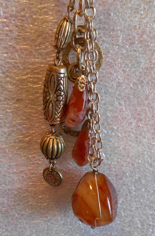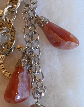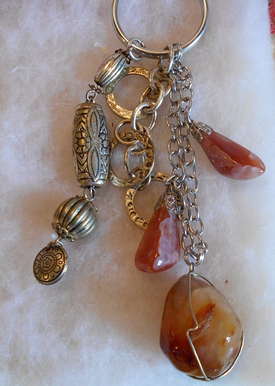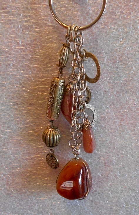 This is a unique one-of-a-kind keychain (or key ring) made by a local artist. The materials used include: Agate stones, with the main stone about an inch oval, two smaller stones measures an inch, clasped with silver or silver-tone clasps/wire, and silver-tone chain is about two inches. The silver beads may be real silver (not definite) and the other charms are silver-tone metal, and the metal keyring is about an inch. Overall length is about 5 inches.