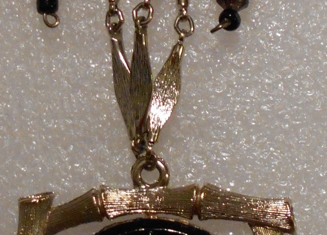 This is a unique one-of-a-kind keychain (or key ring) made by a local artist. The materials used include: A Japanese-Chinese theme metal-tone main pendant, with black painted metal center, surrounded by gold-tone metal bamboo design, measures about two by two inches, with gold-tone chain, measures about two and a half inches. The charms are glass and plastic beads, and the metal keyring is about an inch. Overall length is about 6 inches.