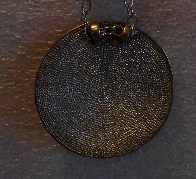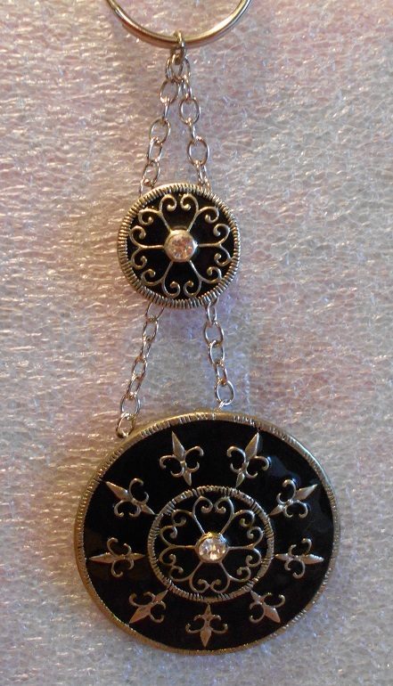 This is a unique one-of-a-kind keychain (or key ring) made by a local artist. The materials used include: Enameled metal mounted with silver-tone chains, measures about two inches. The silver-tone chain is about three inches, and the metal keyring is about an inch. Overall length is about 6 inches.