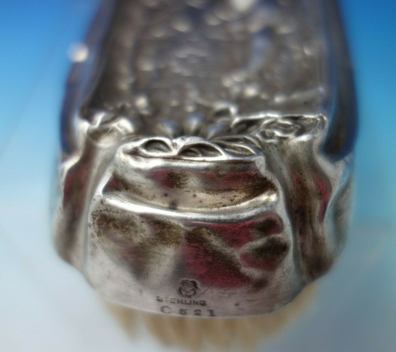 Superb Nursery Rhyme by International sterling silver shoe brush featuring boy and flute calling birds motif. This brush is marked #C521 and measures 2 3/4" tall x 7". It is not monogrammed. This piece is being offered as-is due to a few dings (see photos). Wonderful piece!