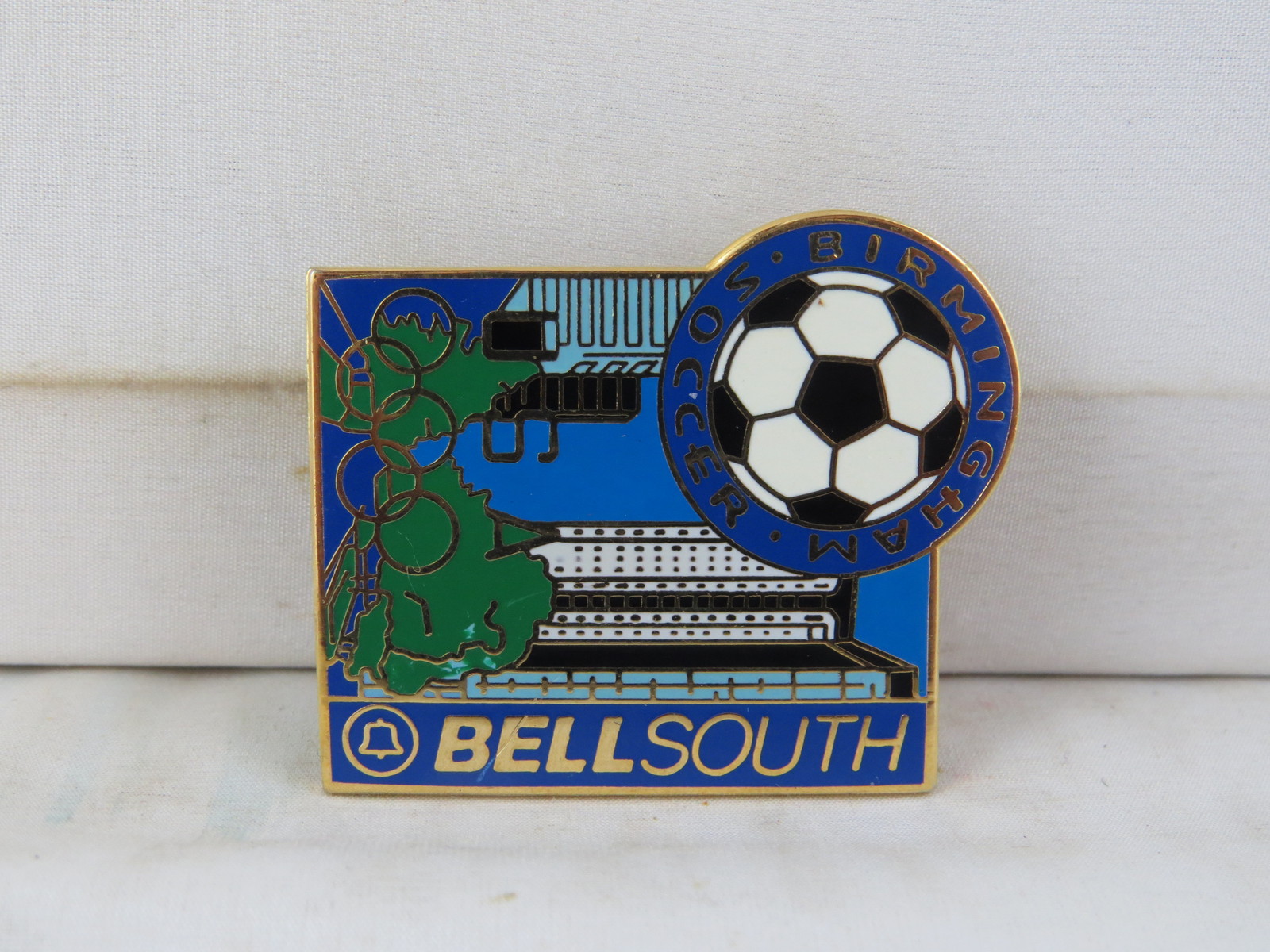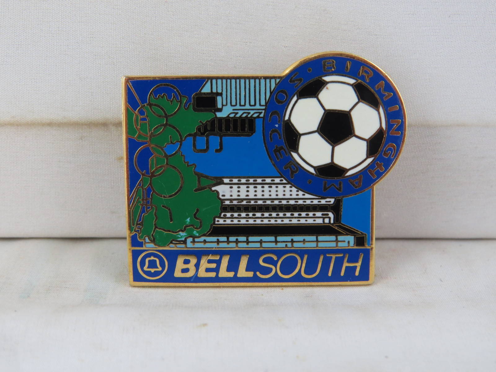 Up for sale is a vintage Olympic pin. It is an event location pin from the 1996 Olympic pin. The pin is for the soccer event location in Birmingham Alabama. The pin has a soccer ball on one side with the event stadium in the middle. The lower portion of the pin has the location sponsor Bell South inlaid. What a great addition to any Olympic collection.