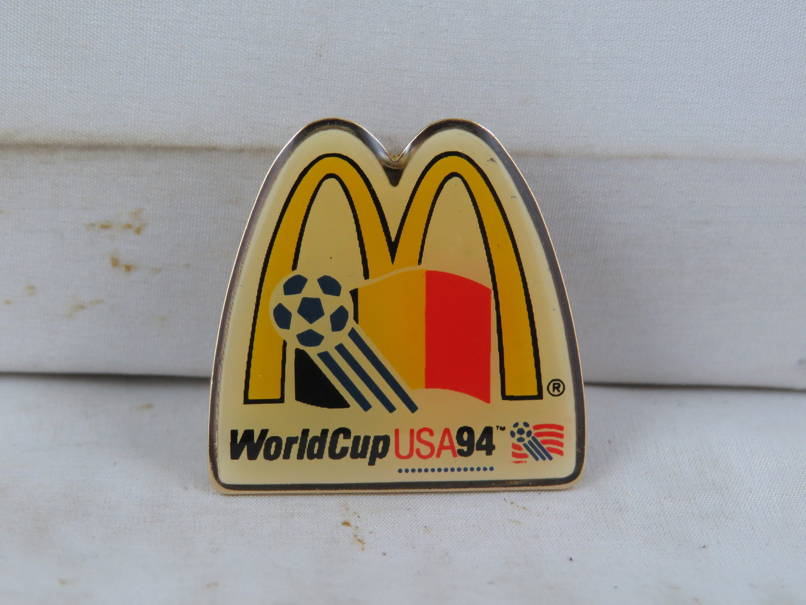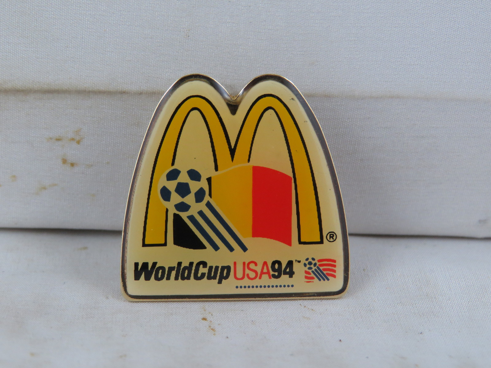 Up for sale is a vintage World Cup of Soccer pin. This pin is a promotional piece from McDonald's. The pin has the McDonald's Golden M logo as the background. The lower portion has the Belgian flag with the 94 soccer ball logo zooming across it. The bottom of the pin has World Cup 94 screened on. What a great addition to any soccer collection.
