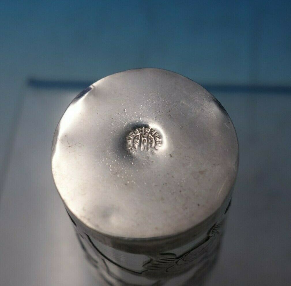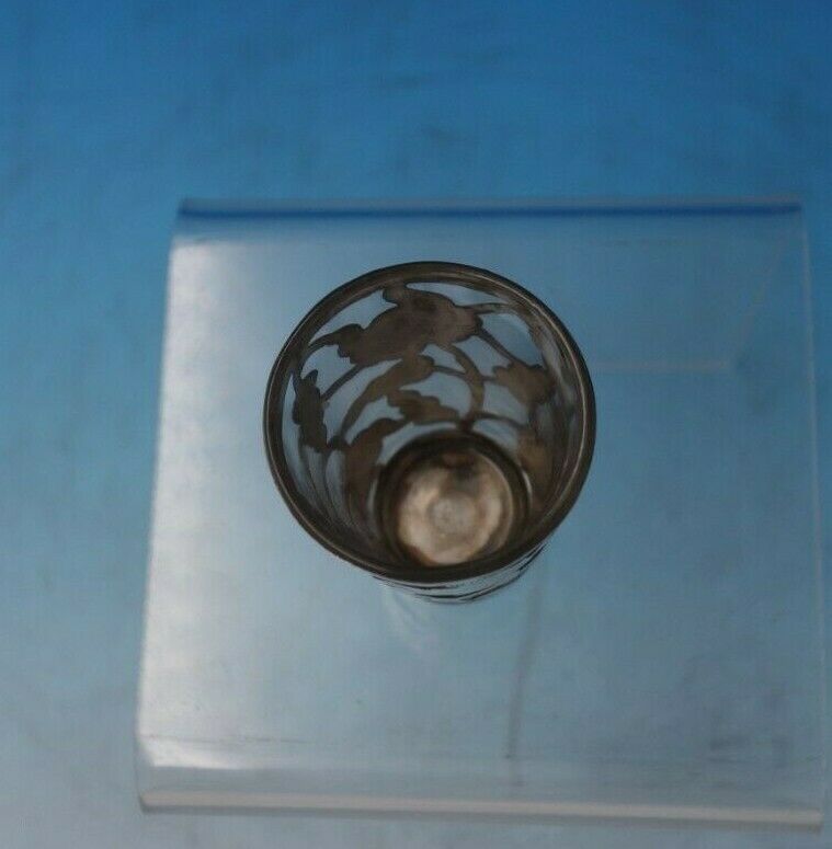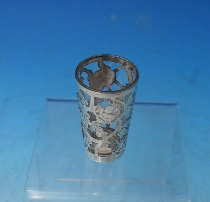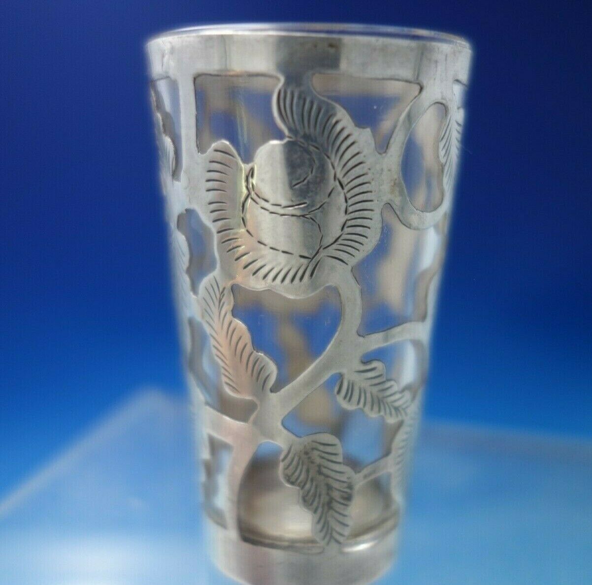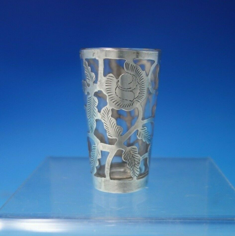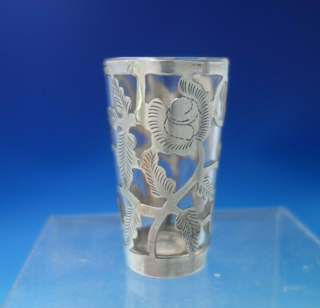 Marvelous Mexican shot glass with rose motif sterling silver overlay, circa 1960 (maker unknown). This piece measures 2 1/2" tall x 1 1/2". It is not monogrammed and is in good vintage condition. Wow!