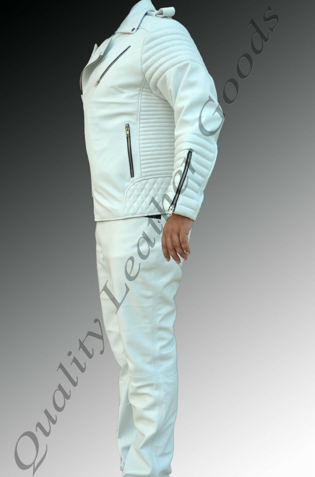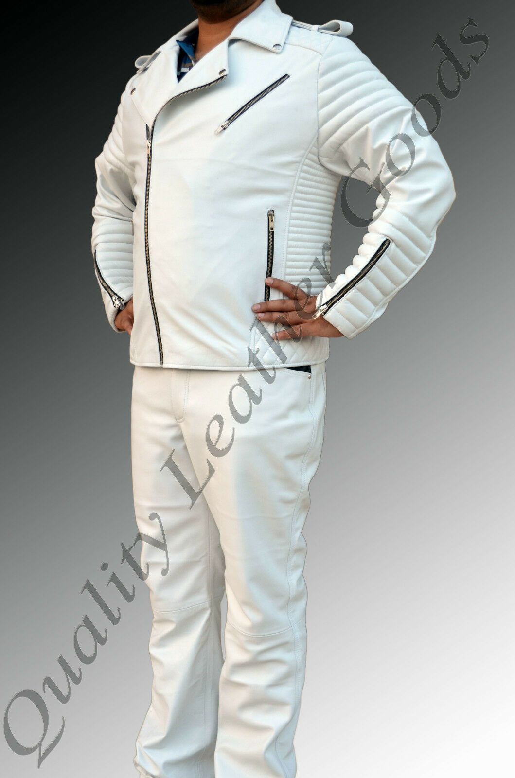 GENUINE LEATHER LEDER VINTAGE 80's QUILTED ROCK BIKER JACKET CUIR WHITE