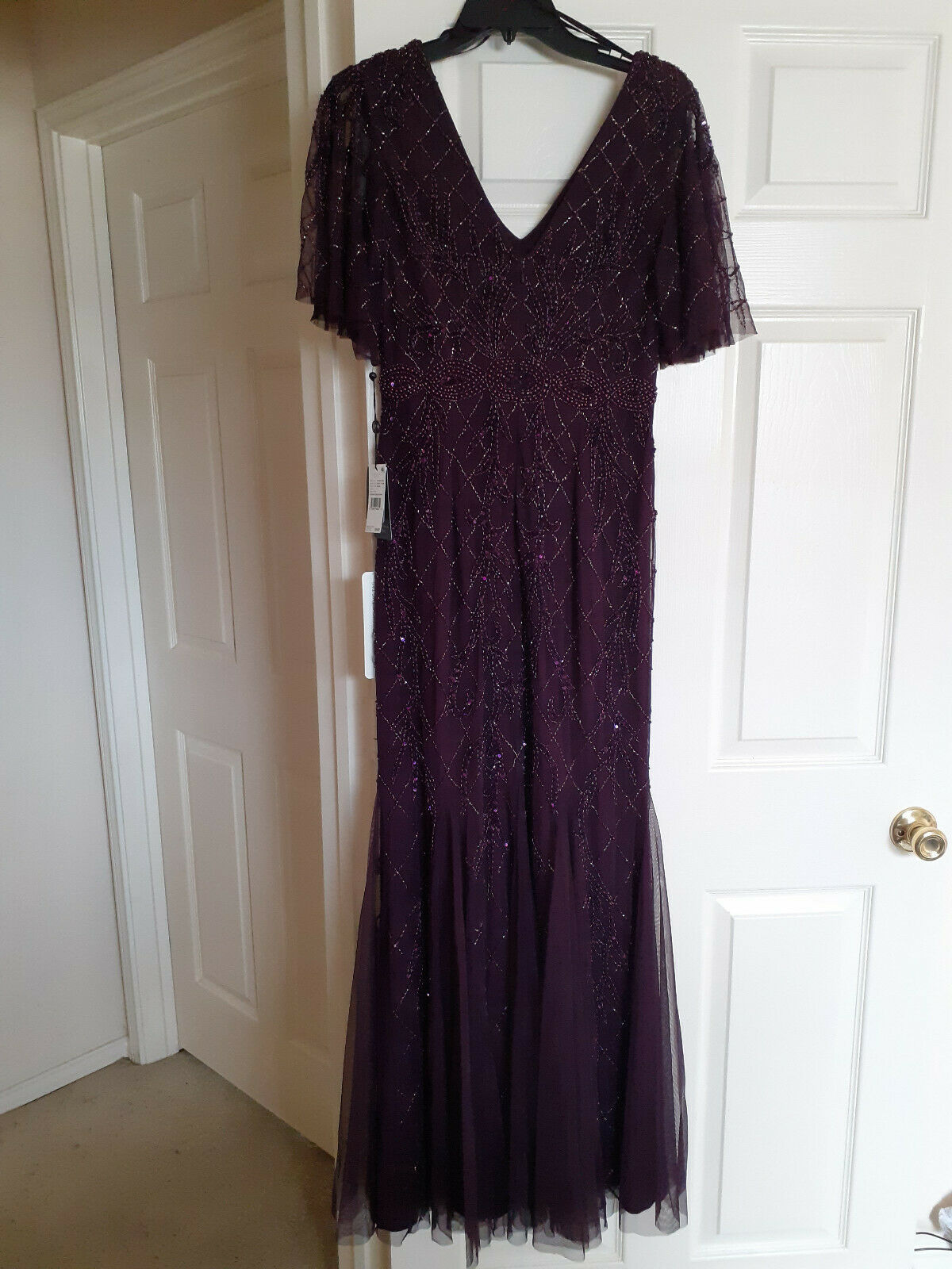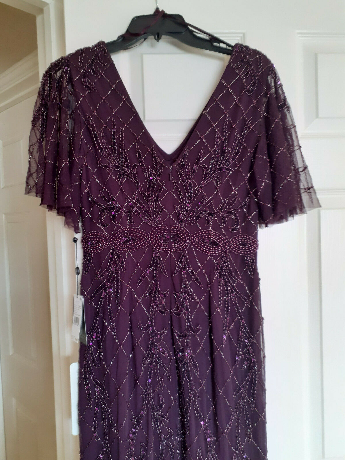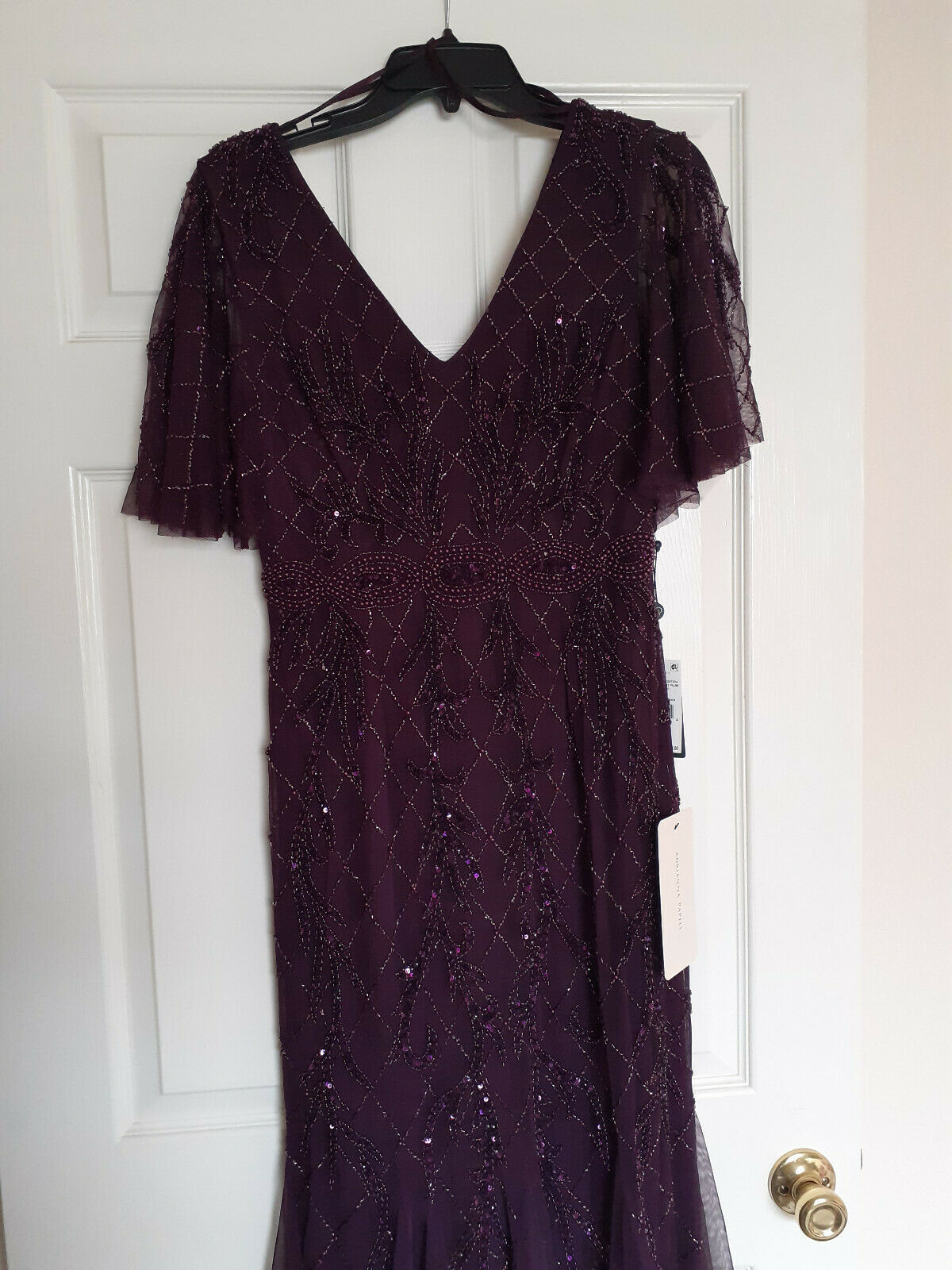 Adrianna Papell Night Plum Beaded Lattice Gown with Flutter Sleeves 6 $349