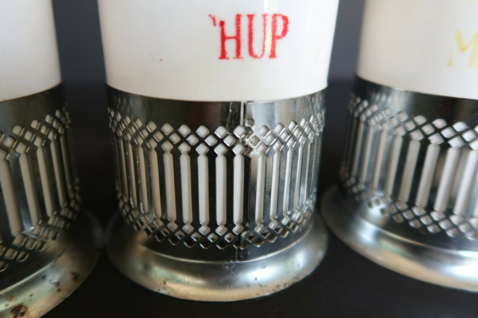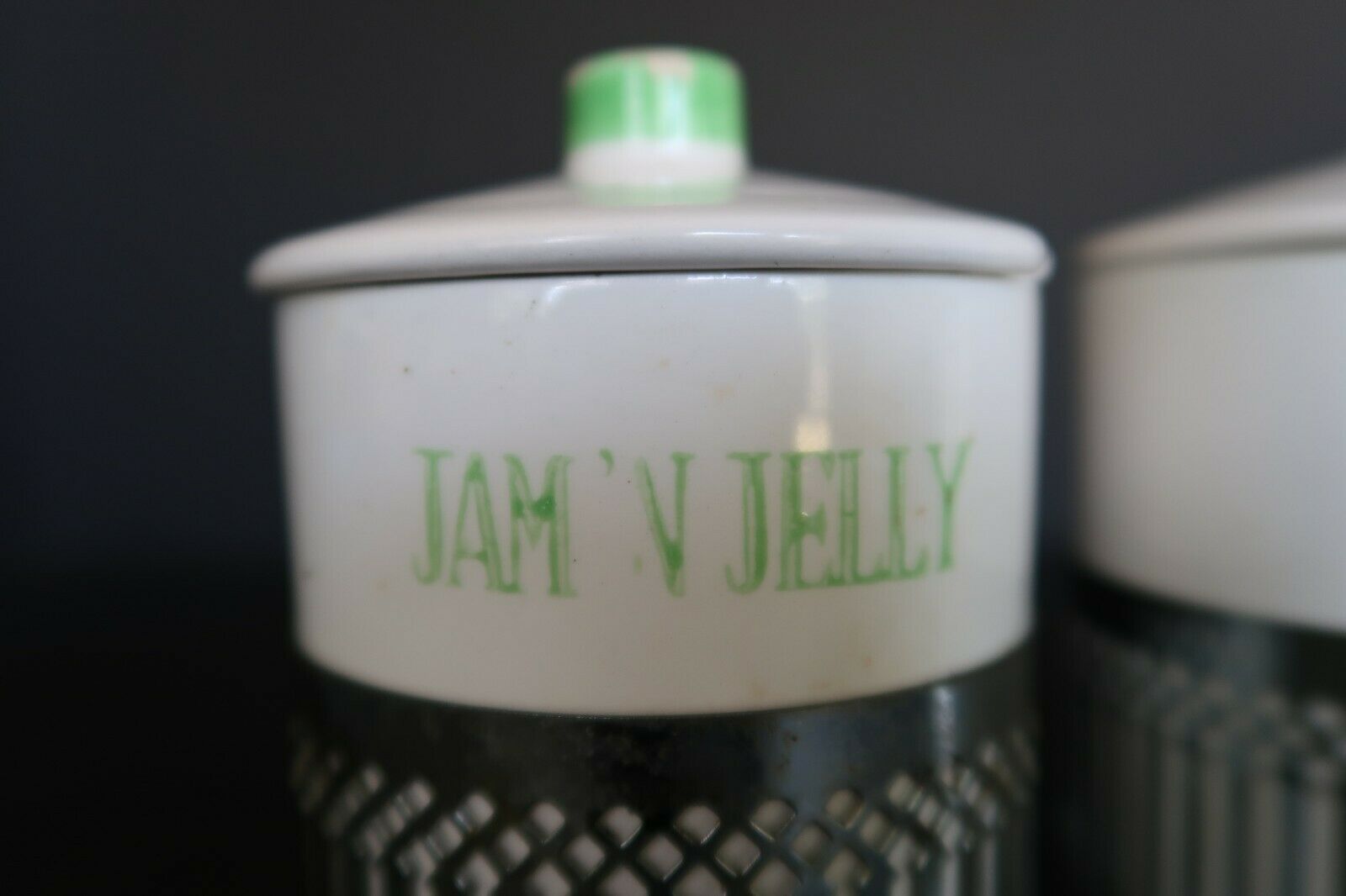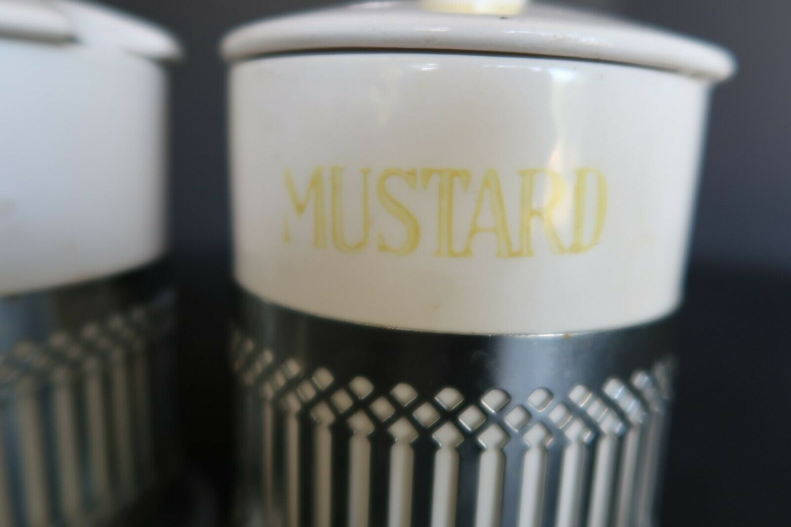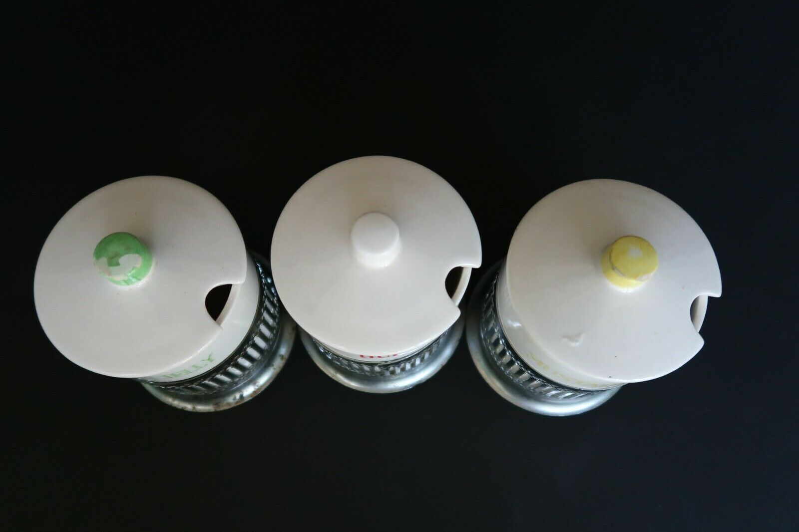 Vtg set of 3 MCM porcelain & metal condiment jars mustard ketchup jam & jelly