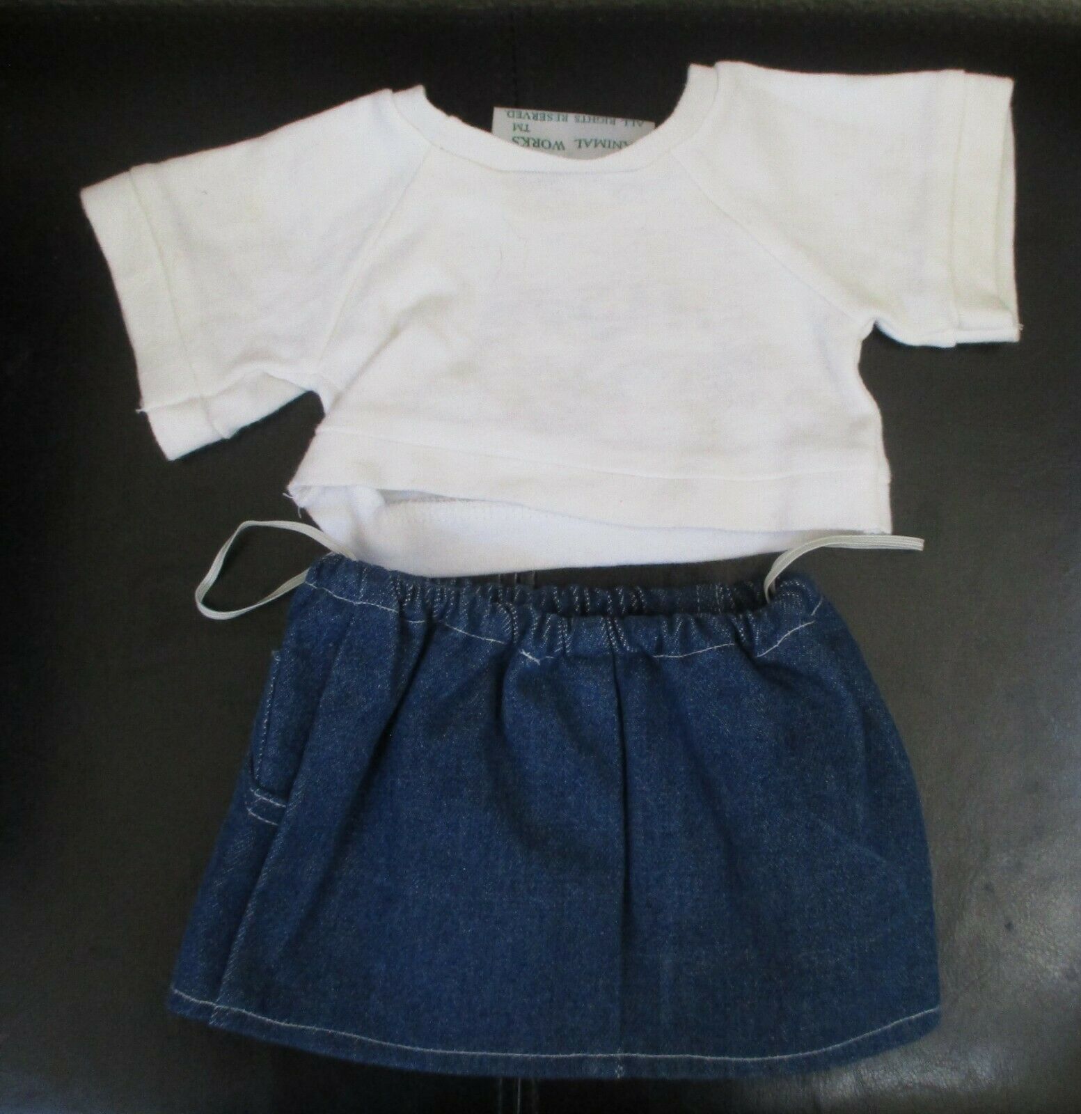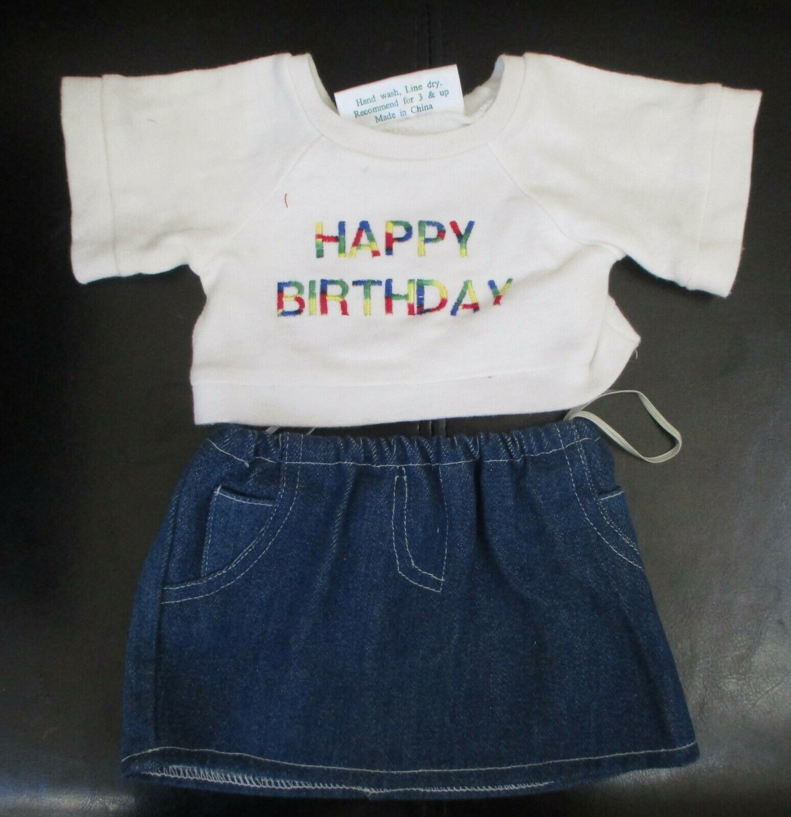 Vintage Animal Works Bear Clothes Happy Birthday Shirt With Denim Skirt. Fits 16" stuffed animals. Interchangeable with Build A Bear. Very good condition. Same or next day ship.