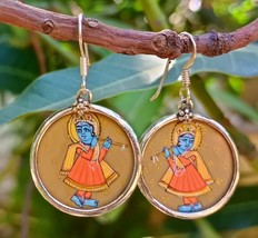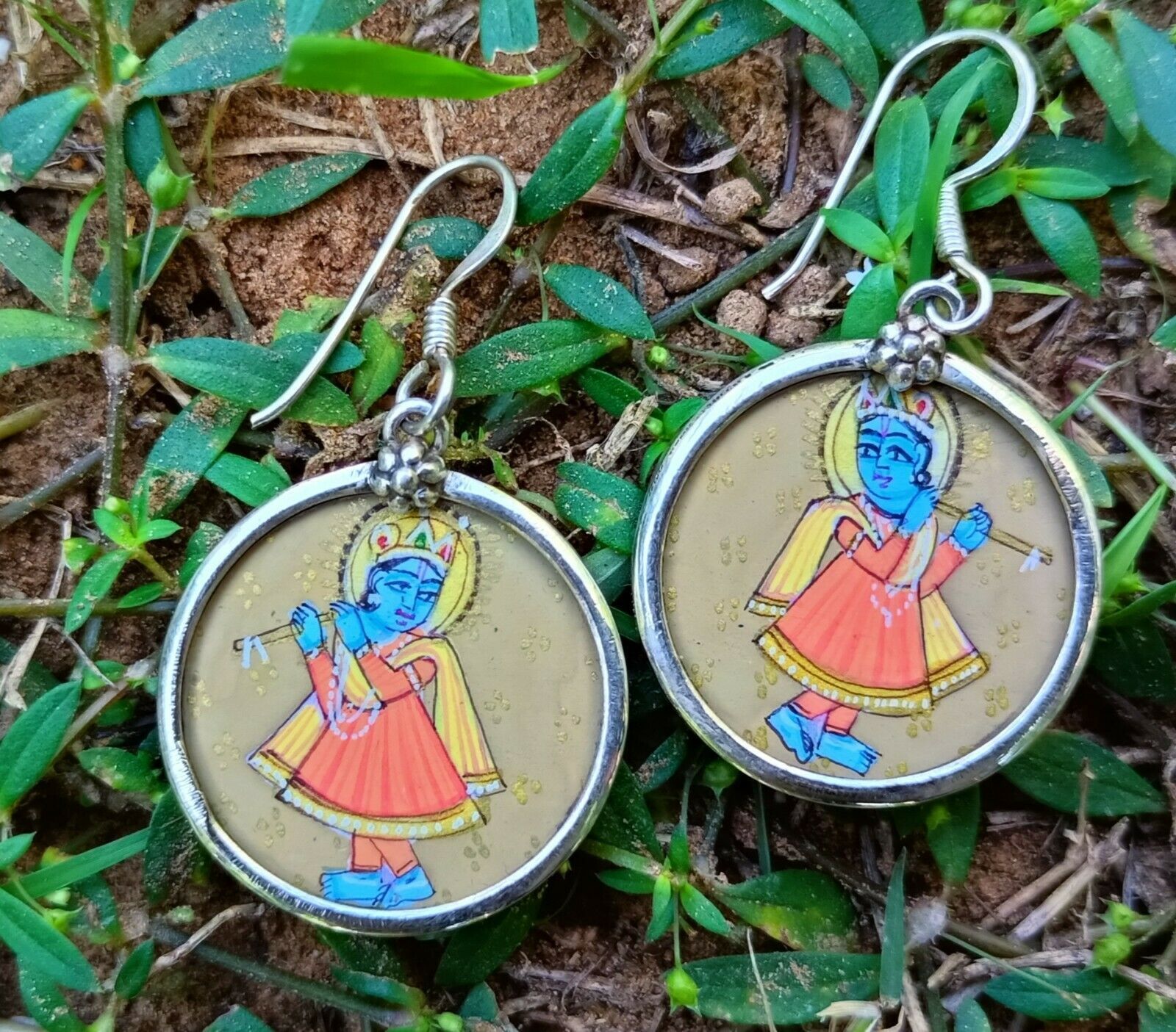 Handmade Hand Painted Indian Miniature Art Painting 925 Sterling Silver Glass Framed Beautiful Religious Lord Krishna/ Kanha/ Laddu Gopal/ Madan Mohan/ Madan Gopal earrings/ ear rings - with bansuri flute in hands.