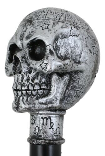 Decorated and etched with symbols of astrology, this realistically designed, cold cast-resin figurine has been uniquely sculpted into the image of a human skull. The skull is the handle of the decorative cane, connected to the black stick shaft made of resin and fiberglass.