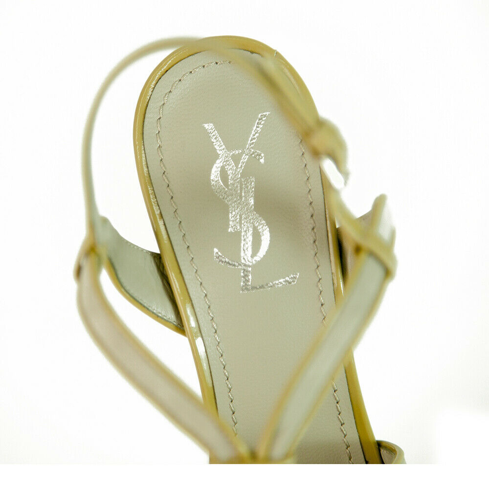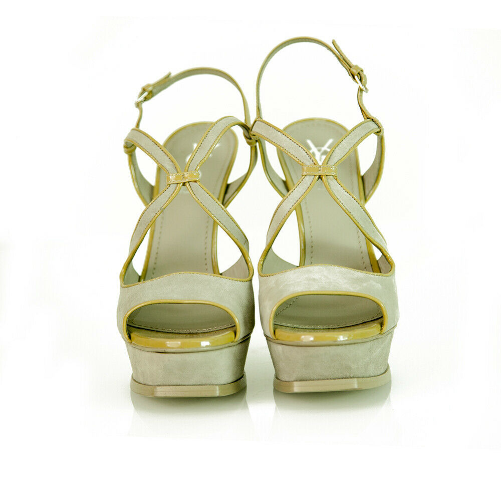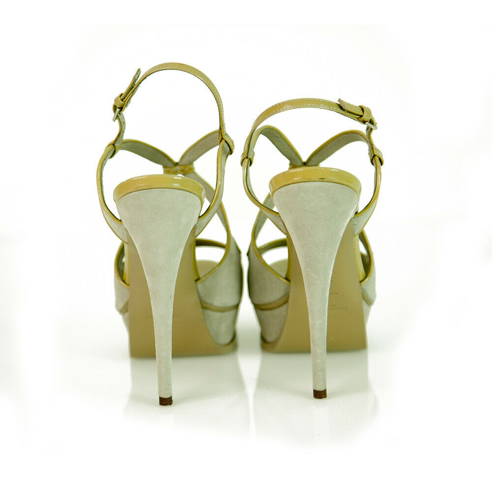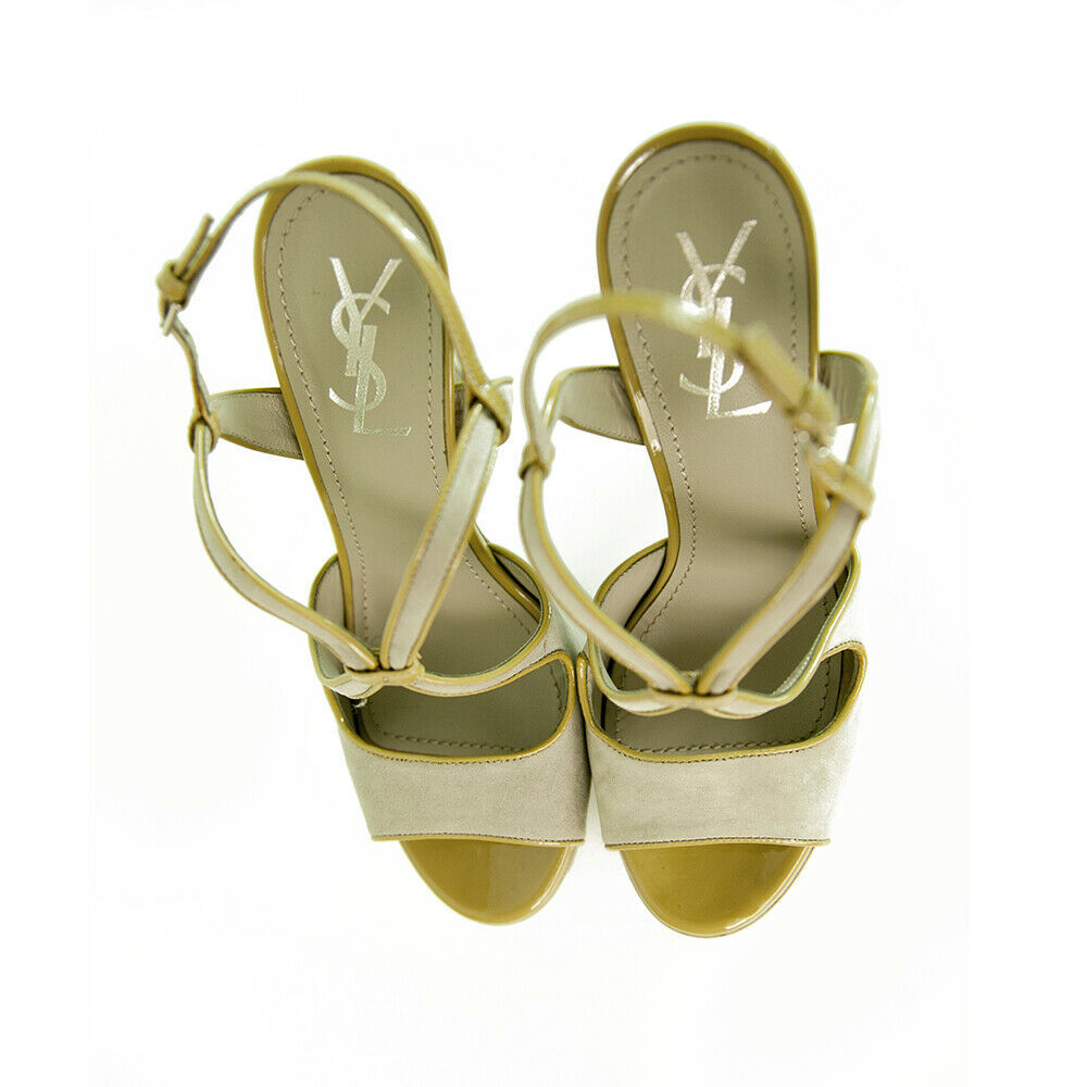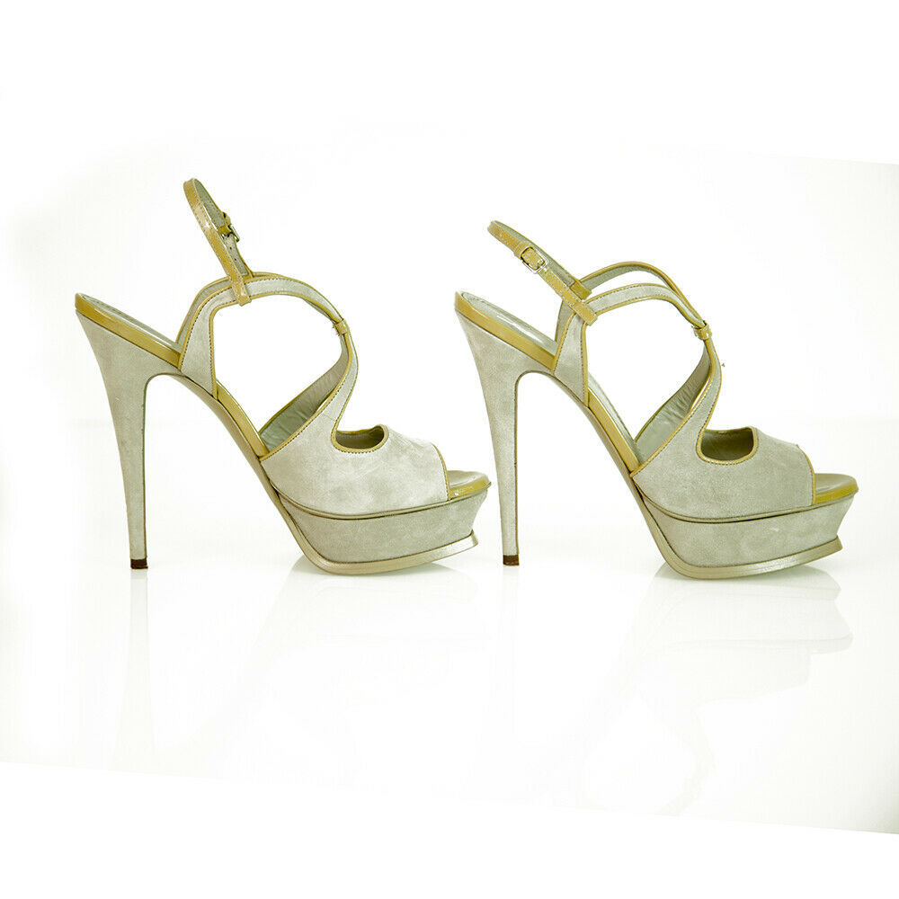 Stand out from the crowd with these YSL amazing slingback platform sandals! These sexy and elegant heels feature gray suede with tan patent leather trim exterior, almond open front, slingback, ankle strap and gray leather insoles. These sandal pumps are accessorised with: Self-covered heel 150mm, Covered platform 40mm, Leather lining and sole. Padded insole. Made in Italy. These are excellent chic pumps, from YSL perfect for any fashionista!