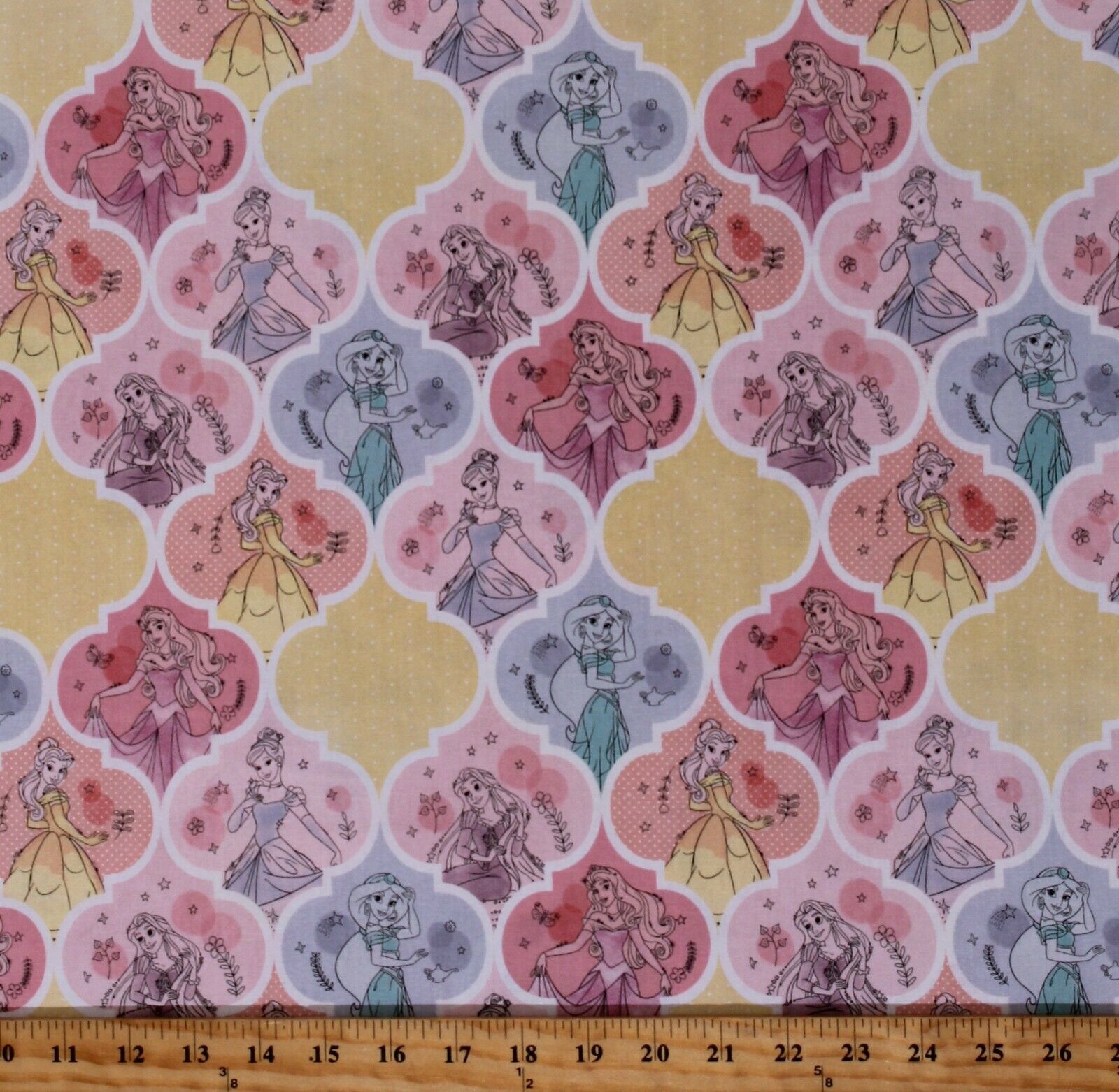 Cotton Kids Disney Princesses Videos Movies Cinderella Belle Jasmine Sleeping Beauty Rapunzel Dresses Pretty Princess Patch Pink Cotton Fabric Print by the Yard (20259)