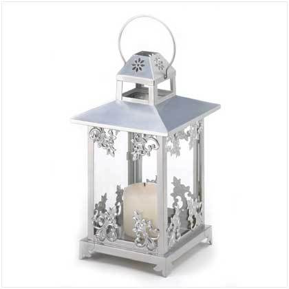 Gleaming silver finish and graceful scrollwork lend old-fashioned opulence to a classic candle lantern. An elegant decoration to enjoy, night and day! Also makes an artistic display for your favorite small houseplant or miniature figurine. Handle at top for hanging.