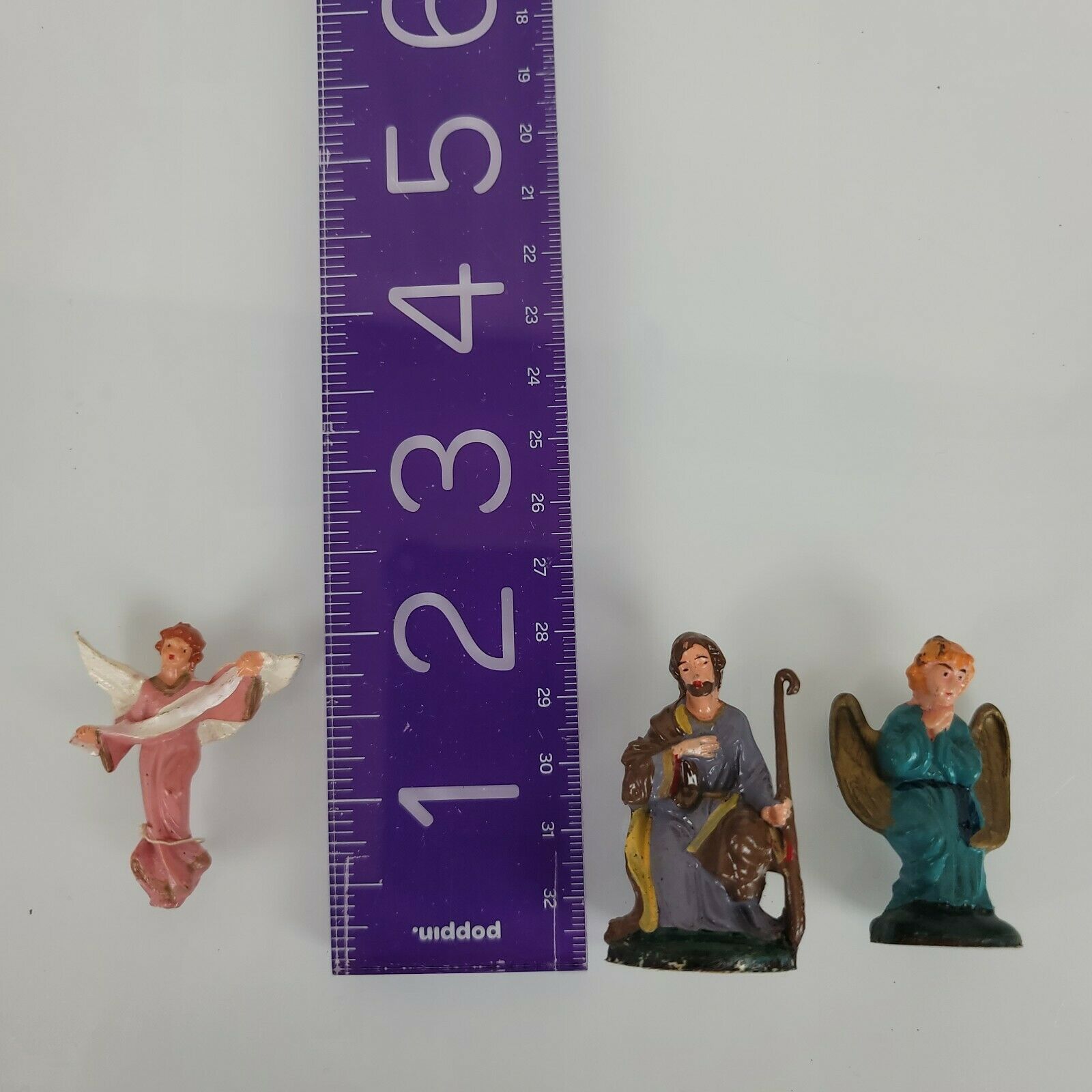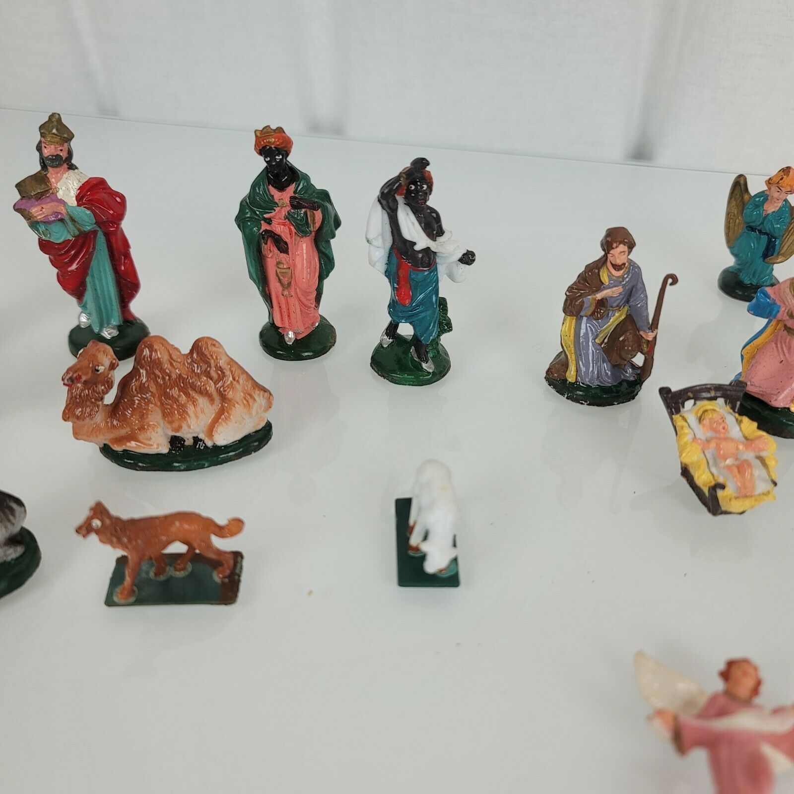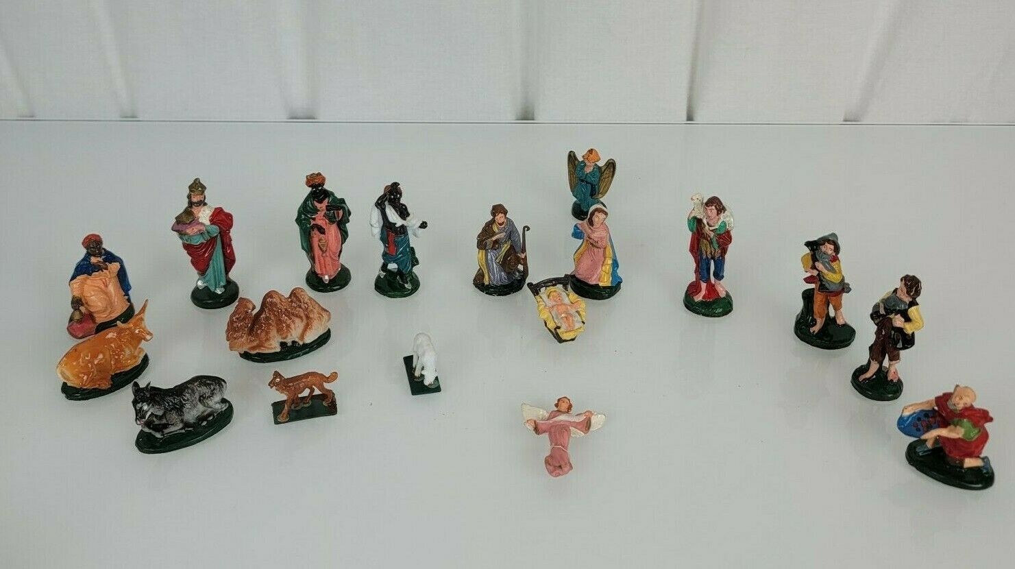 18 Piece set includes Jesus, Mary, Joseph, 3 Wise men, 5 shepherds / villagepeople, 2 angels, 5 animals. 2.5" tall figures, overall good condition, 1-2 may have very minor paint rubs or paint chips. From a clean, non-smoking and pet-free home.