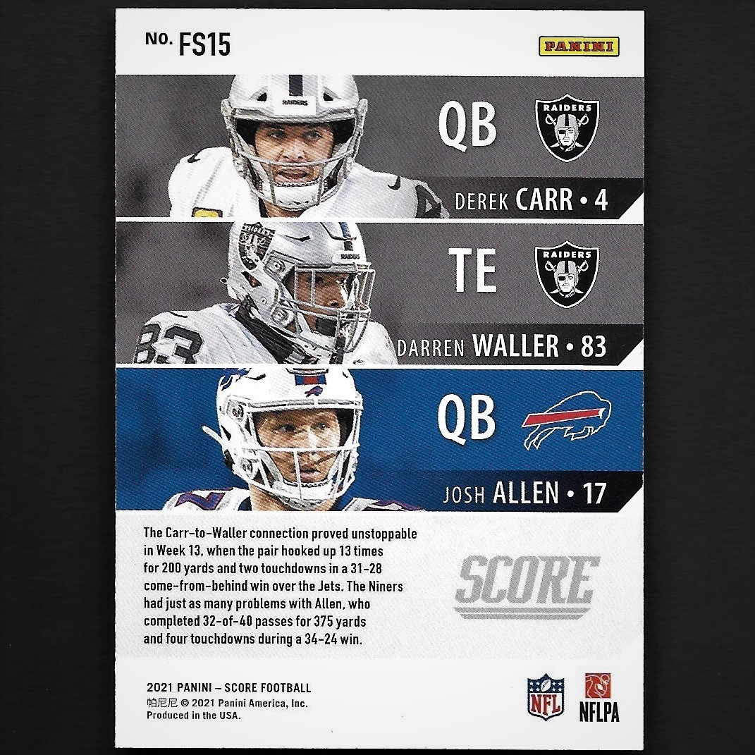 Derek Carr/Darren Waller/Josh Allen triple autographed 2021 Panini card #15