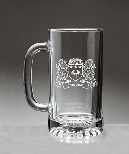 Shannon Irish Coat of Arms Beer Mug with Lions. This is the big beer mug with the handle that allows you to swing your glass while you're singing that Irish song. Or maybe just to have a drink with a heavy handled friend. High quality sand etched with your authentic Irish coat of arms and family name. Dishwasher and microwave safe. Capacity 16 oz and heavy duty double walled clear glass with handle.