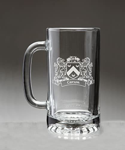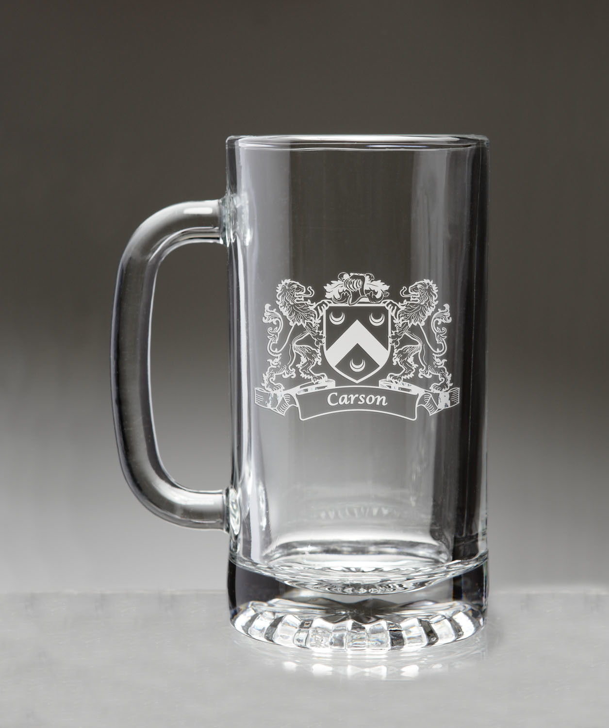 Product description: Carson Irish Coat of Arms Beer Mug with Lions. This is the big beer mug with the handle that allows you to swing your glass while you're singing that Irish song. Or maybe just to have a drink with a heavy handled friend. High quality sand etched with your authentic Irish coat of arms and family name. Dishwasher and microwave safe. Capacity 16 oz and heavy duty double walled clear glass with handle.