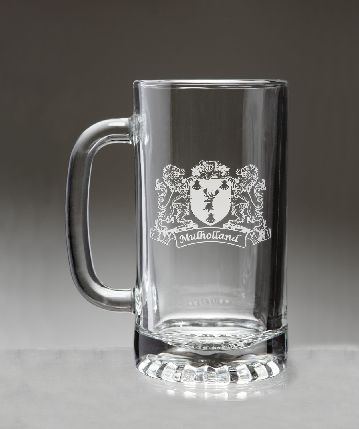Mulholland Irish Coat of Arms Beer Mug with Lions. This is the big beer mug with the handle that allows you to swing your glass while you're singing that Irish song. Or maybe just to have a drink with a heavy handled friend. High quality sand etched with your authentic Irish coat of arms and family name. Dishwasher and microwave safe. Capacity 16 oz and heavy duty double walled clear glass with handle.