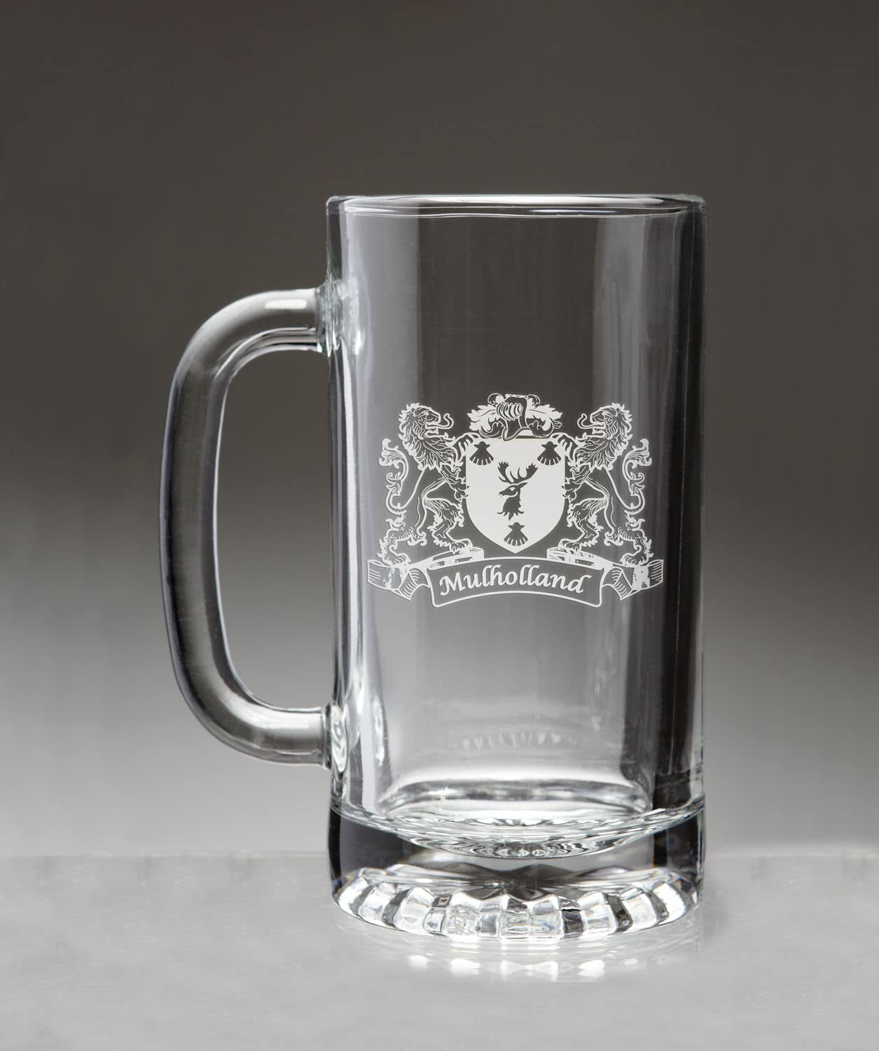 Product description: Mulholland Irish Coat of Arms Beer Mug with Lions. This is the big beer mug with the handle that allows you to swing your glass while you're singing that Irish song. Or maybe just to have a drink with a heavy handled friend. High quality sand etched with your authentic Irish coat of arms and family name. Dishwasher and microwave safe. Capacity 16 oz and heavy duty double walled clear glass with handle.