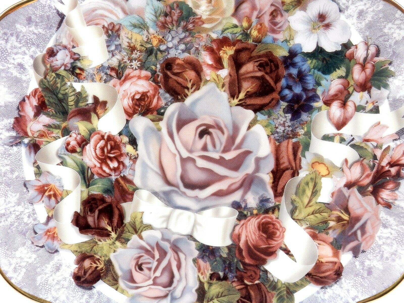 Plate artwork features clusters of roses accented with wildflowers and ribbon