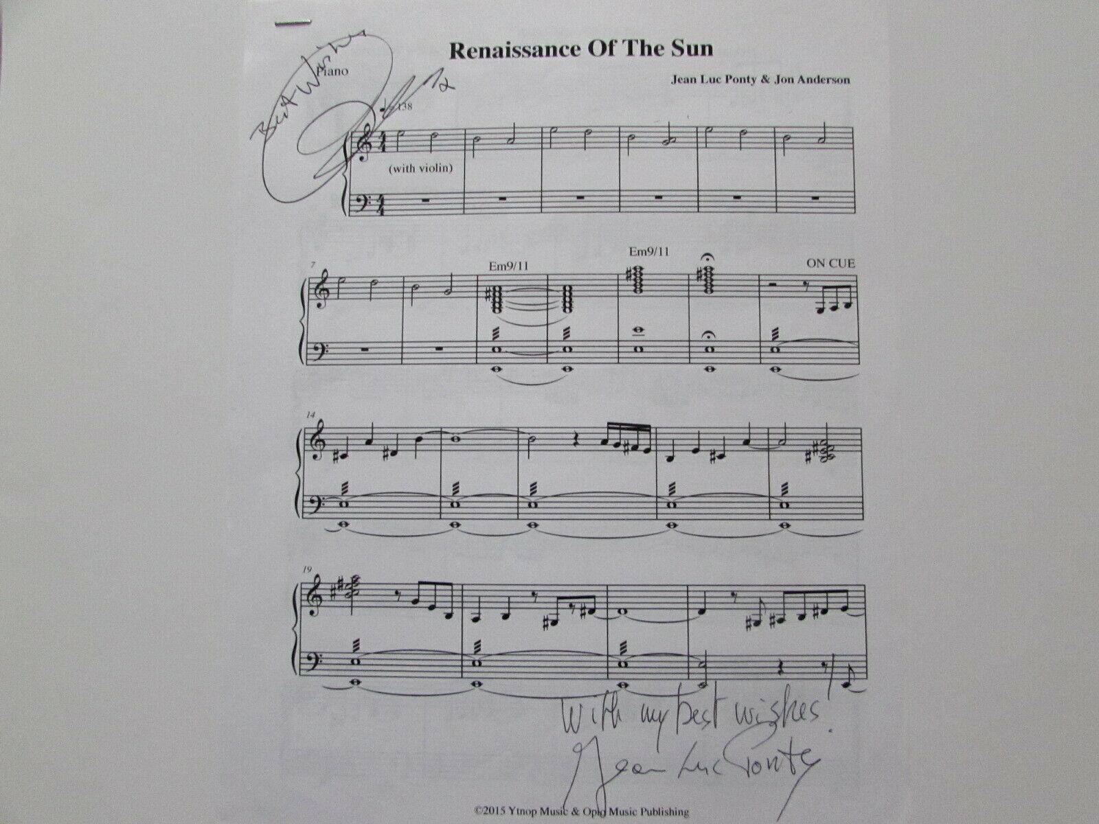 JON ANDERSON AND JEAN LUC PONTY HAND SIGNED BY BOTH ARTISTS ON SHEET MUSIC FOR "RENAISSANCE OF THE SUN" DURING THE ANDERSON PONTY BAND PROJECT