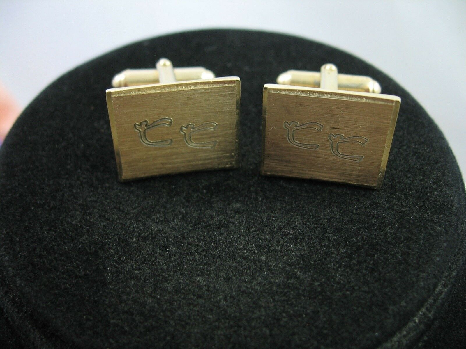 In a goldtone metal, this pair of vintage cuff links are rectangular in shape. Each one has a pair of "C" shaped designs. Uncertain as to what they are or what they mean but one guess is that they are horse related. Perhaps a type of spur or some other bridle piece?